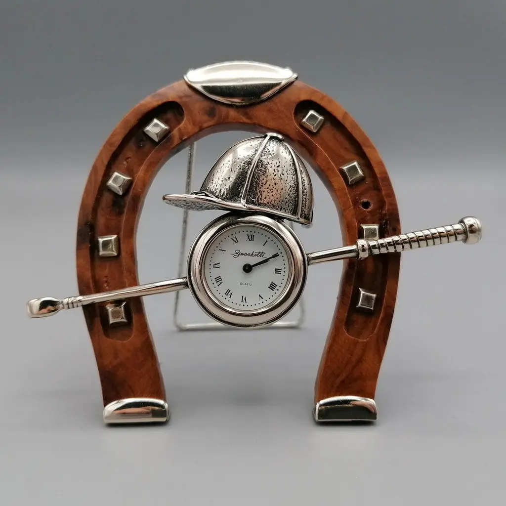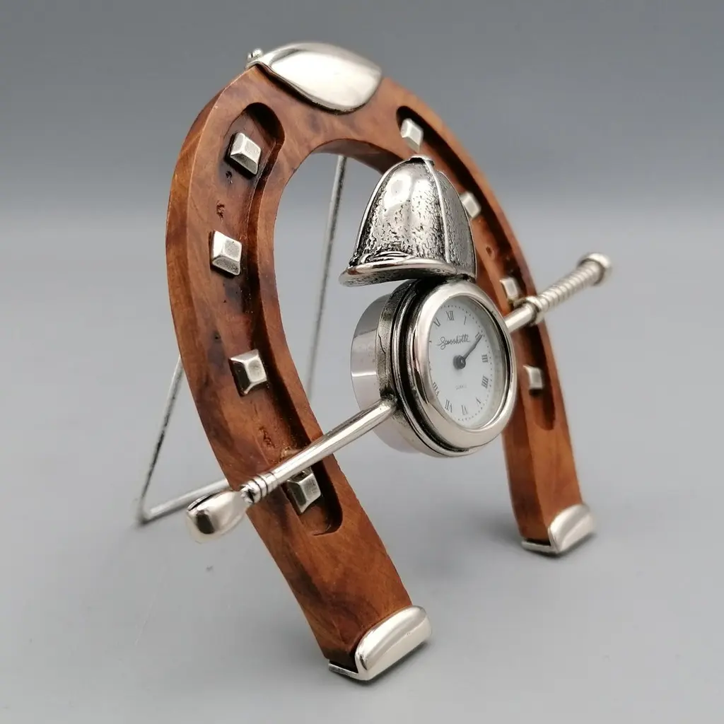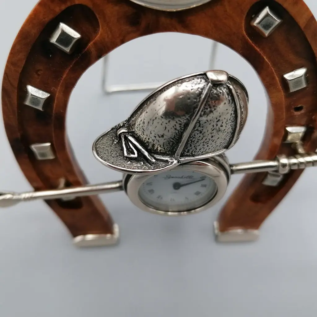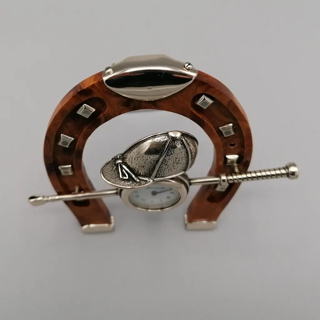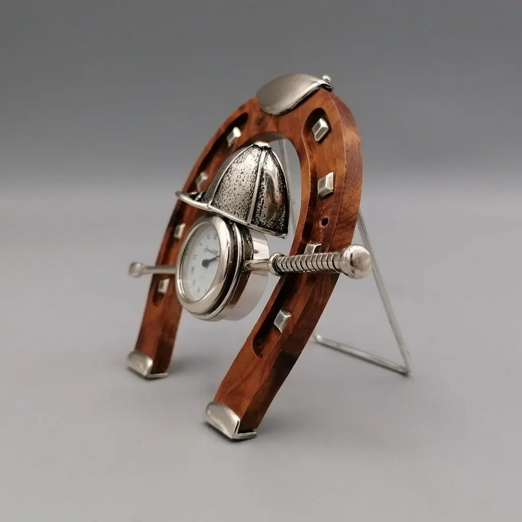 Table clock in 800 silver and wood depicting polo game equipment.The bat and polo hat are part of the watch. The briar horseshoe has silver details on the base and top.The back support is also in silver.