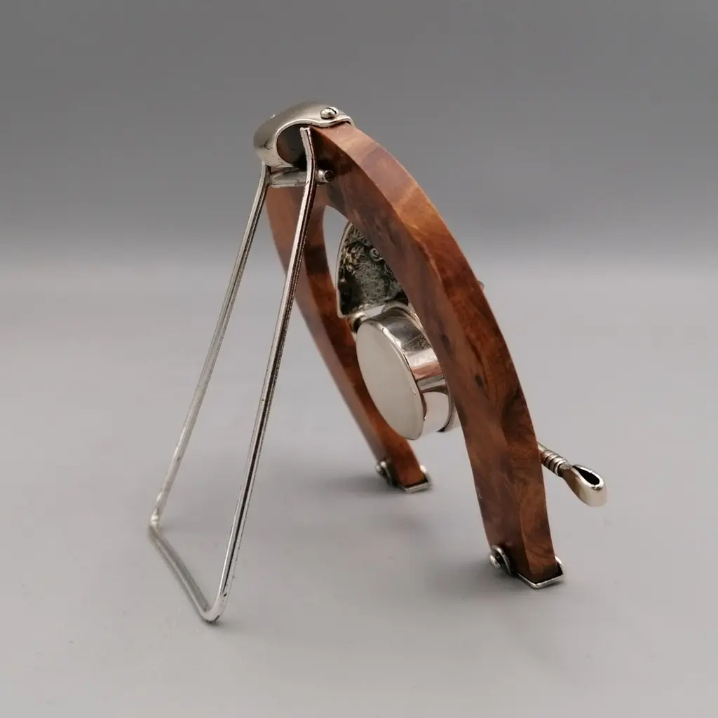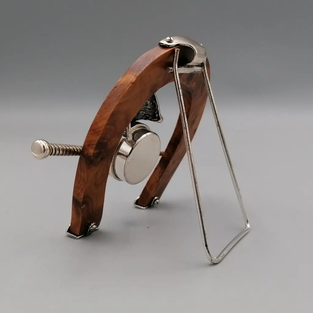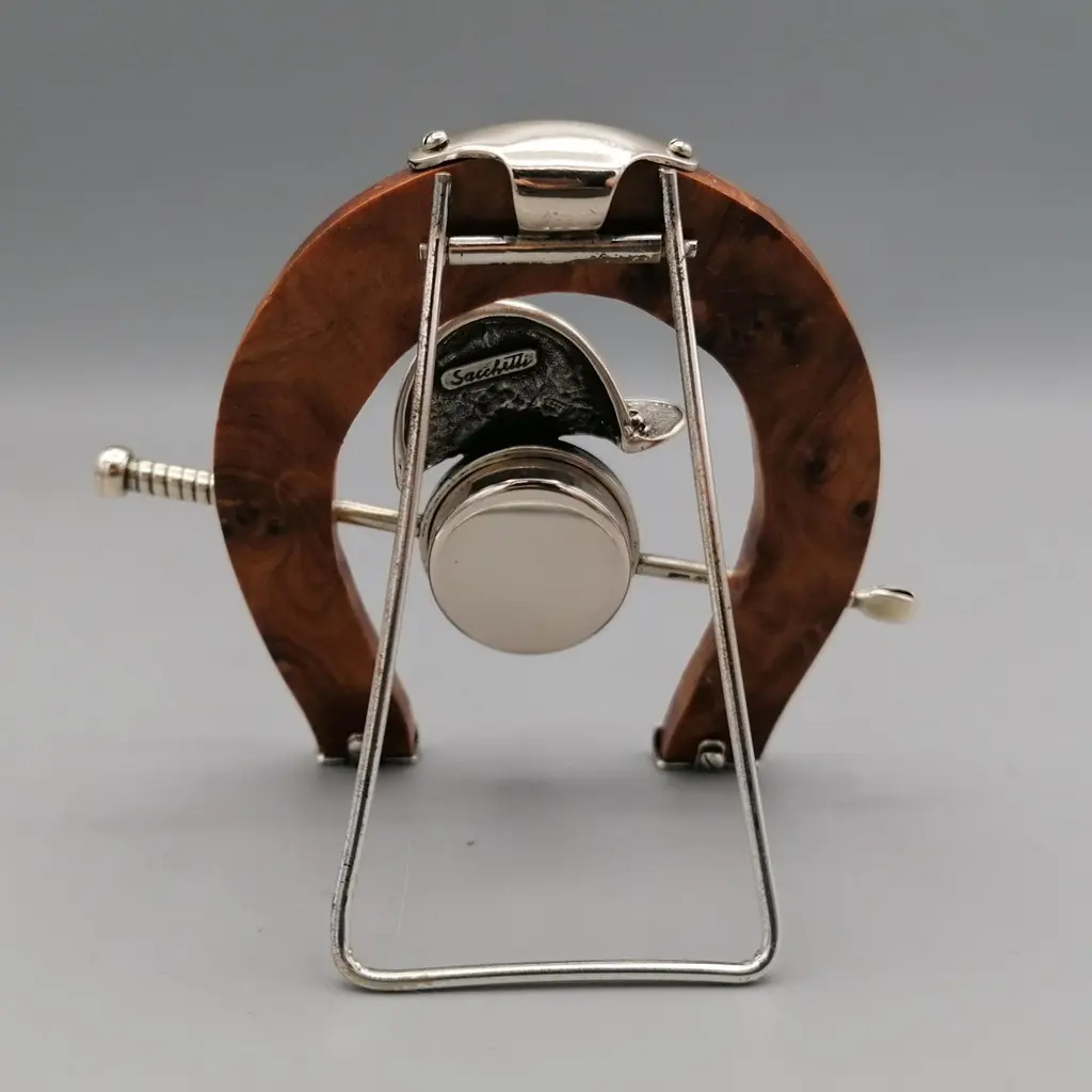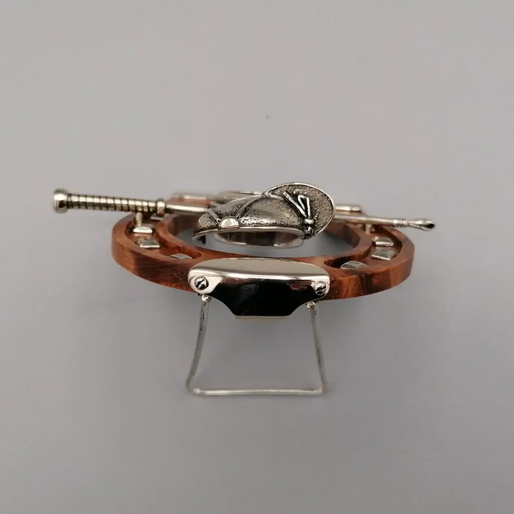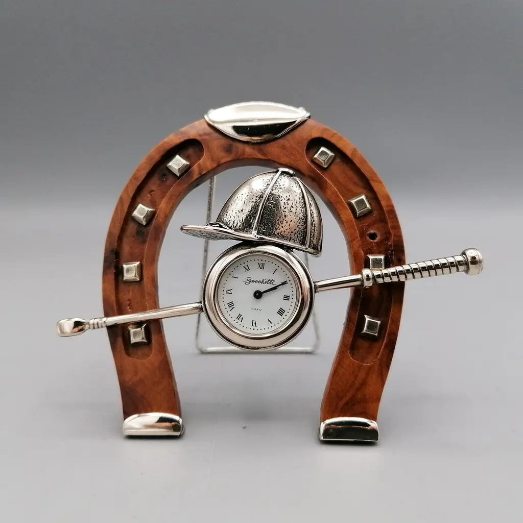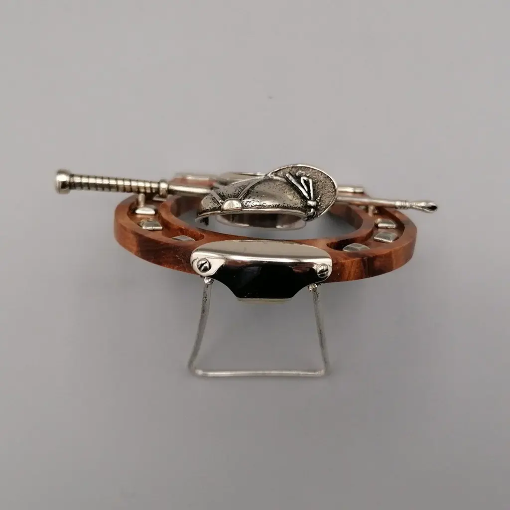 Table clock in 800 silver and wood depicting polo game equipment.The bat and polo hat are part of the watch. The briar horseshoe has silver details on the base and top.The back support is also in silver.