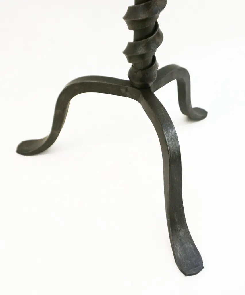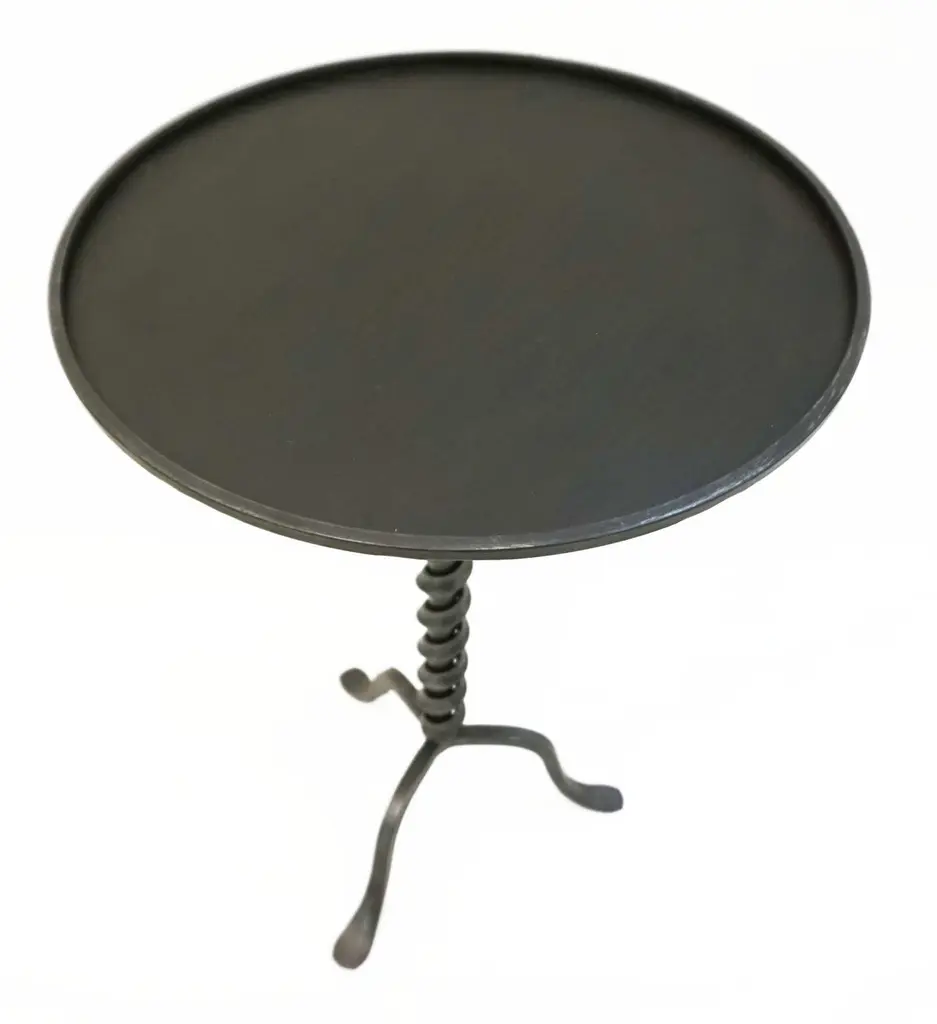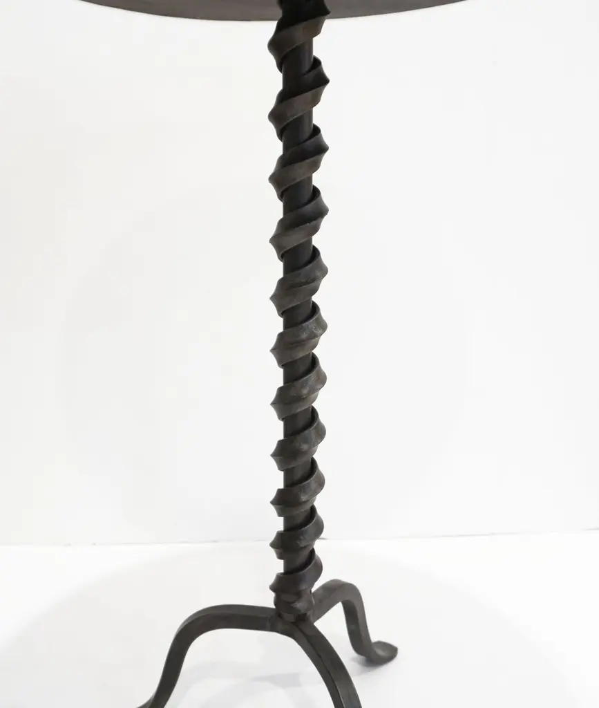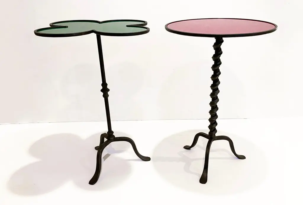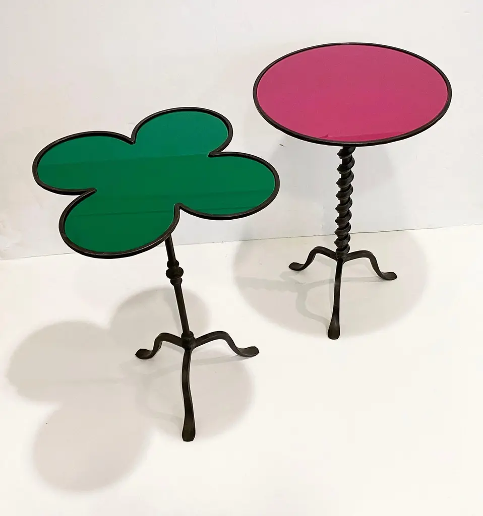 Add fun with color to your environment, outdoor and indoor! This contemporary cast iron side table, entirely handcrafted in Italy, will certainly delight with a glass top customizable in any color of your choice. This organic modern tripod piece presents an artistic side with a twisting motif coming up the central stem and functionality with a raised border to keep in check your drinks and the removable glass top in case the table needs to stay outside under the rain.Contact us with your favorite color!