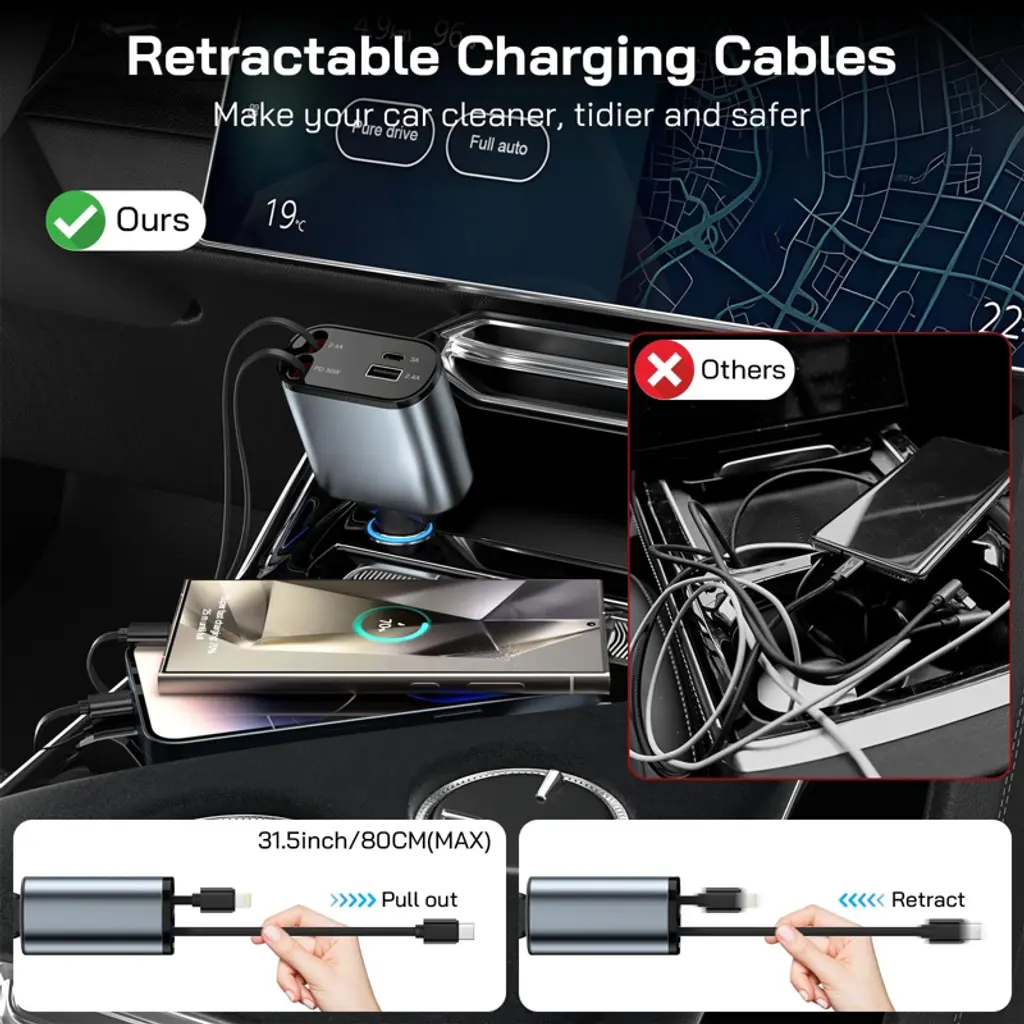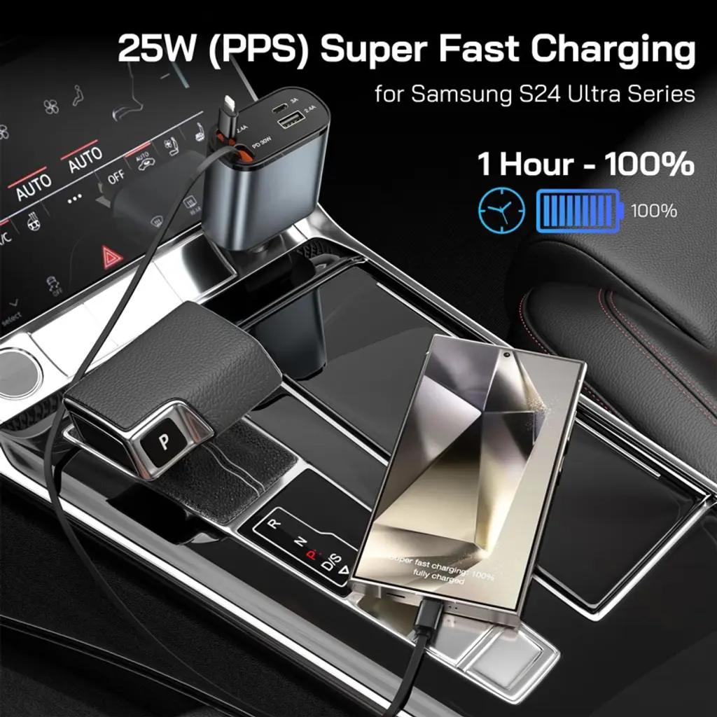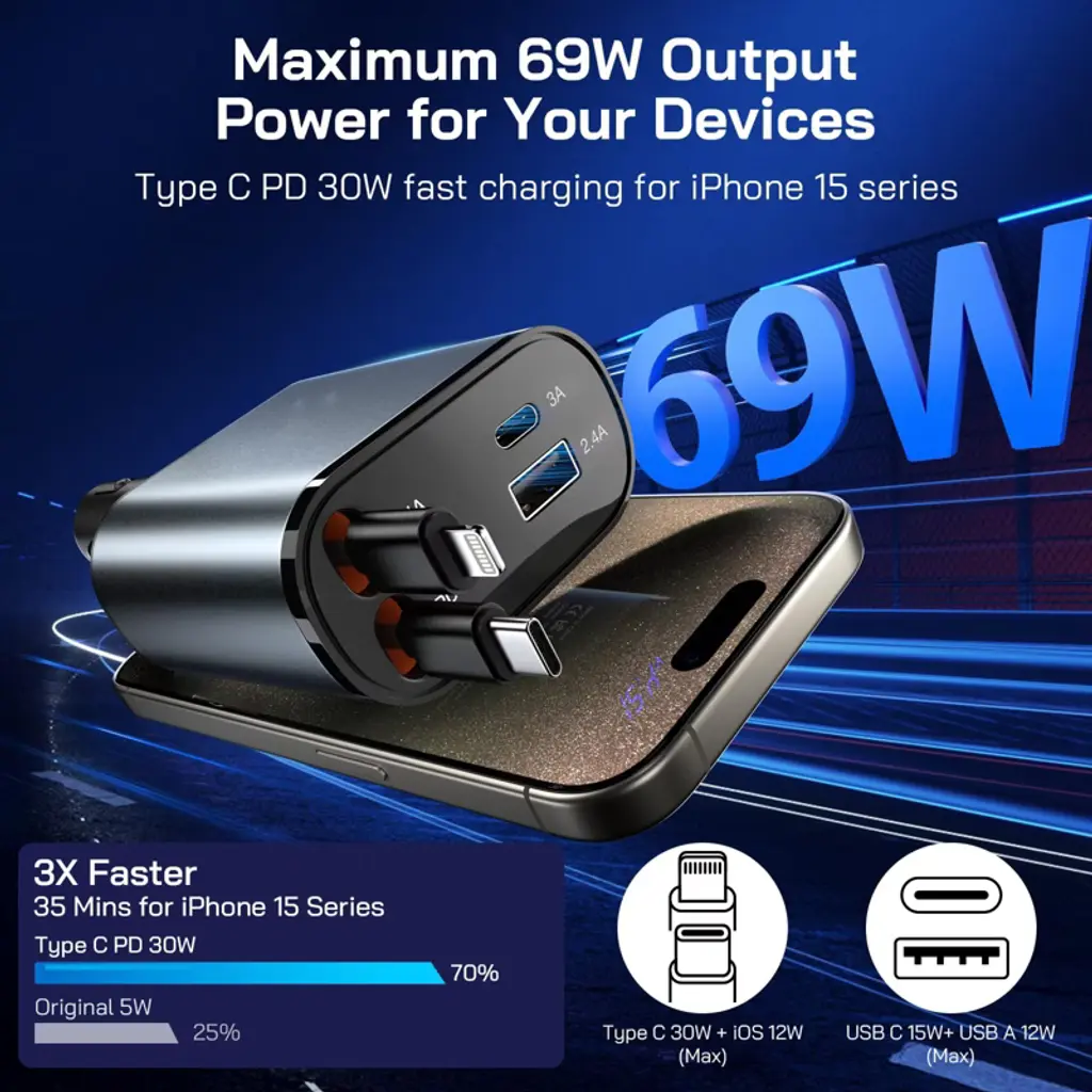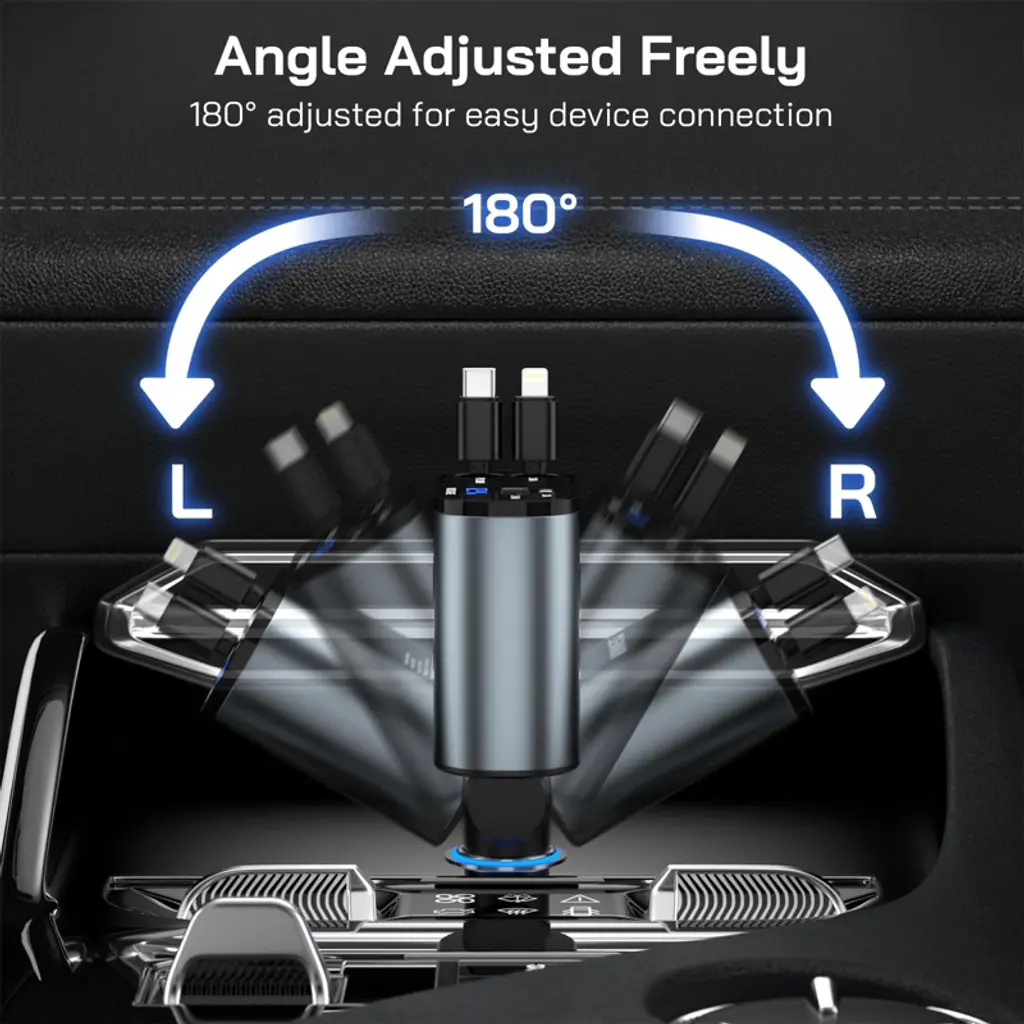 Get the 2-pack retractable 4-in-1 car charger, a game - changer for your in - car charging needs! With a maximum output power of 69W, it charges 3X faster than ordinary chargers. The charger features two retractable cords (PD Type C + iOS) and two charging ports (USB A + USB C), enabling you to charge four devices simultaneously. The PD/PPS fast charging technology with 30W maximum power ensures super - fast charging for compatible devices. The retractable cables can be pulled out up to 31.5 inches and retract automatically, eliminating clutter. The charger head can be adjusted 180° left to right, allowing for easy charging from the backseat. It's equipped with an intelligent chip and multiple protection systems for safety. This charger supports various fast - charging protocols and is compatible with a wide range of phones and mainstream 12V - 24V vehicle models. Ideal for family trips, daily commutes, or truck drivers, it brings convenience to your on - the - go life.