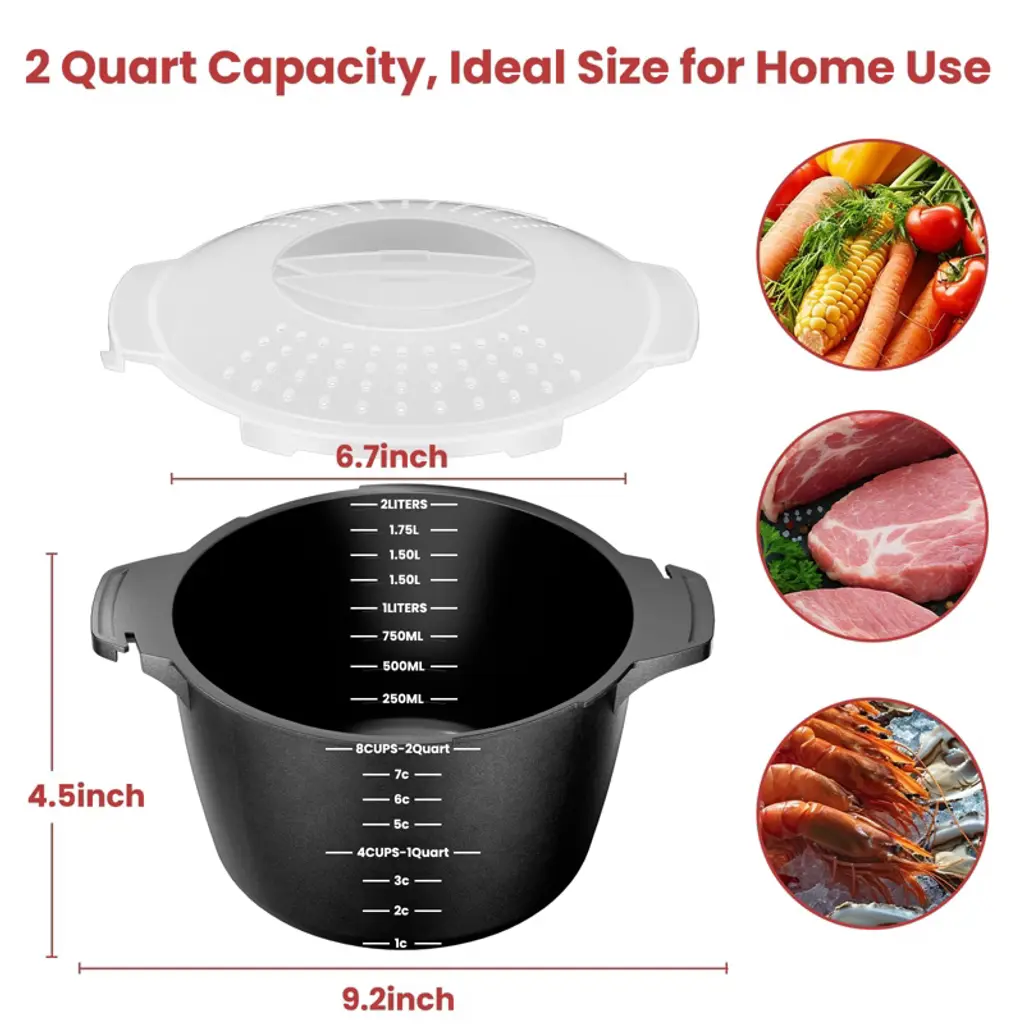 Discover the ultimate microwave steamer! Crafted from high - quality, BPA - free materials, it's healthy, odor - free, and dishwasher safe. This steamer is heat - resistant and stable, ideal for withstanding microwave heat. It comes in three capacities: 1 Quart, 2 Quart, and 3 Quart, suitable for different cooking scenarios, whether it's a small meal for one or a large family dinner. Just place your food in the container, use the removable filter as needed, lock the lid, and pop it in the microwave. After use, cleaning is simple as it's dishwasher safe. With its sturdy construction, it won't deform easily, offering long - term use and bringing great convenience to your daily cooking.
