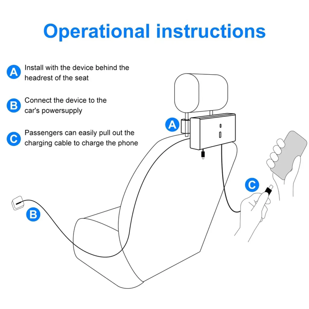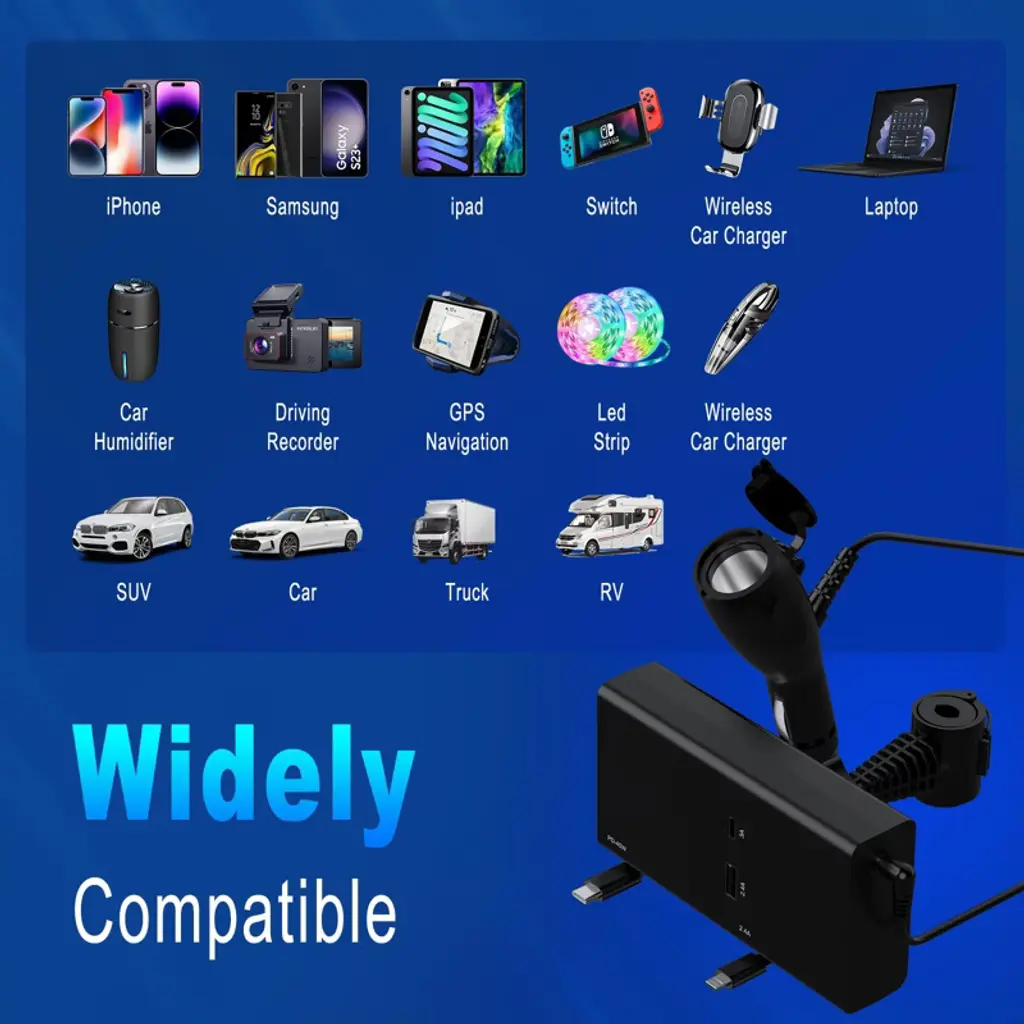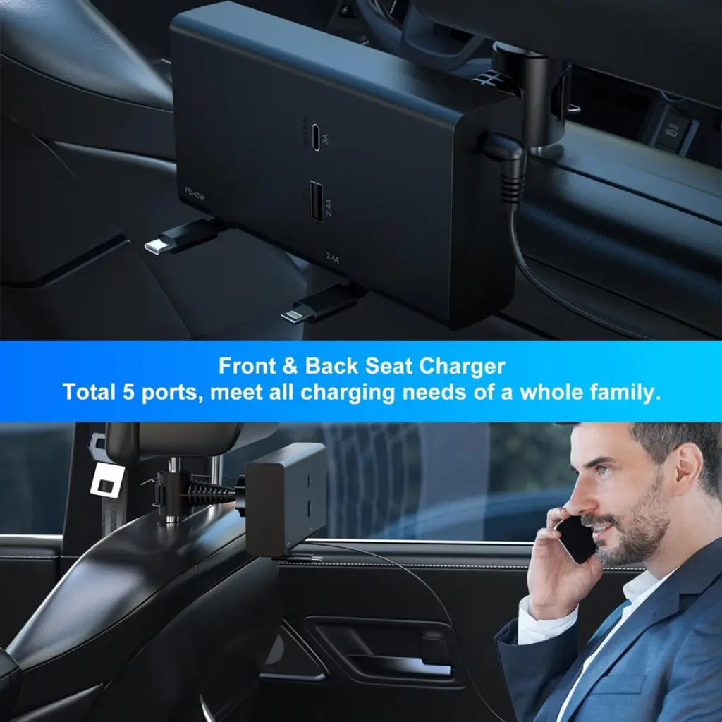 Discover the ultimate 5 - in - 1 multi - car retractable backseat car charger! This charger supports 60W super - fast charging. The Type C (PD) cable can charge laptops and phones at 45W, the iP cable outputs 18W, and other ports offer 5V/2.4A. It's perfect for rideshare drivers, with a 360° rotating base and long - reaching cables. The non - slip pads on the mounting clasp ensure stability. It has an intelligent chip that protects devices from various issues during charging. Installation is a breeze; just attach it to the headrest and plug into the car's USB port. Compatible with a wide range of electronic devices and 12 - 24V vehicles, it's a must - have for anyone on the go, providing a convenient and efficient charging solution for all your devices in the car.