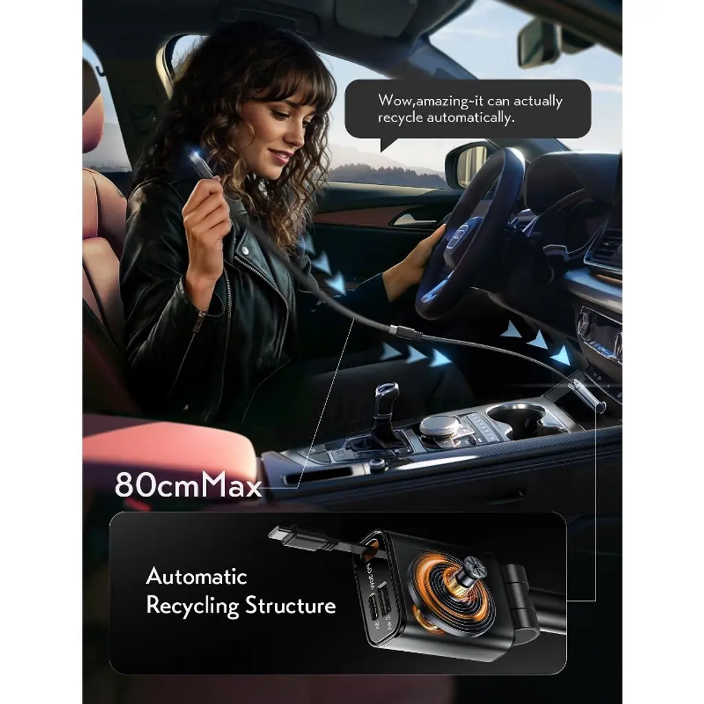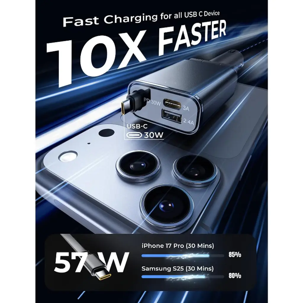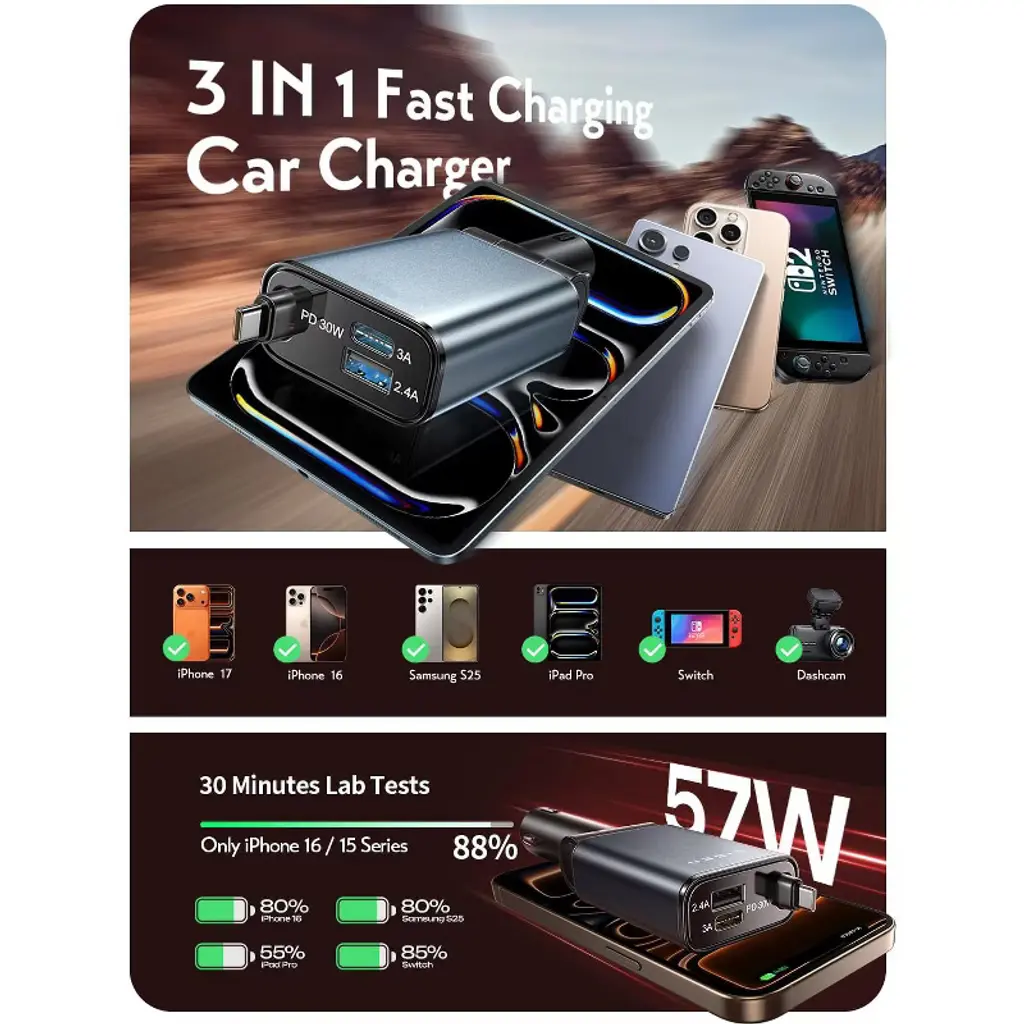 Discover the ultimate car charger for your devices! This car charger offers a 57W charging capacity. It comes with a 30W PD USB C retractable cable that can charge your iPhone 15 and later models, as well as Samsung Galaxy S25 Ultra, from 0% to 80% in just 30 minutes, slashing charging time by half. There are also a 15W USB - C port and a 12W USB - A port, allowing you to charge three devices simultaneously, perfect for family trips or shared rides. The built - in USB C cable is compatible with a wide range of devices including iPhone 17/16/15 series, Samsung series, iPad series, and other Android products. To use it, simply pull the cable, extend it 1 cm, and then release for automatic retraction. Its ultra - mini design takes up 60% less space and is compatible with 99% of vehicle models, ensuring it won't affect the gear shift lever. The retractable cord extends up to 31.5 inches, making it suitable for long - distance travel or tight spaces. With intelligent power management and multiple safety certifications, you can trust this charger for safe and reliable use.