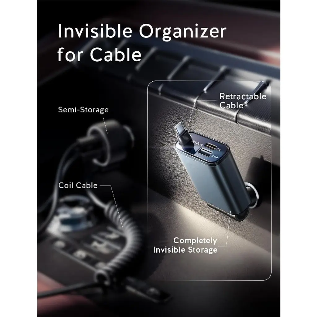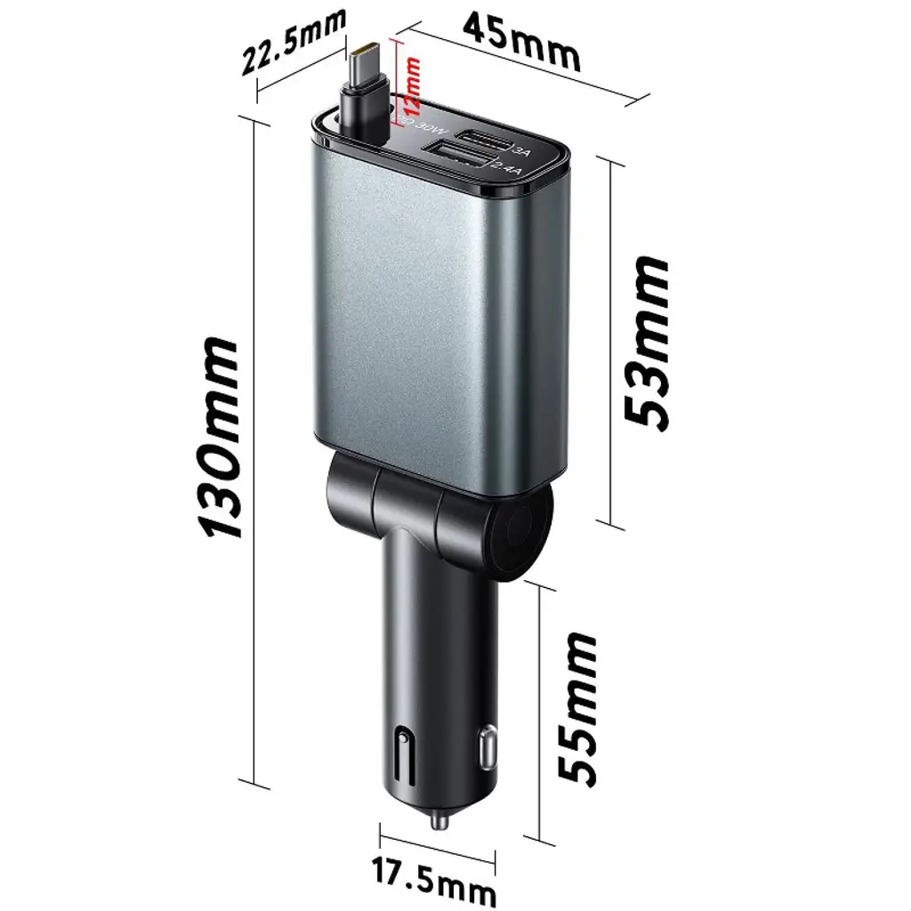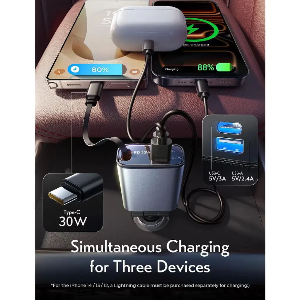 Discover the ultimate car charger for your devices! This car charger offers a 57W charging capacity. It comes with a 30W PD USB C retractable cable that can charge your iPhone 15 and later models, as well as Samsung Galaxy S25 Ultra, from 0% to 80% in just 30 minutes, slashing charging time by half. There are also a 15W USB - C port and a 12W USB - A port, allowing you to charge three devices simultaneously, perfect for family trips or shared rides. The built - in USB C cable is compatible with a wide range of devices including iPhone 17/16/15 series, Samsung series, iPad series, and other Android products. To use it, simply pull the cable, extend it 1 cm, and then release for automatic retraction. Its ultra - mini design takes up 60% less space and is compatible with 99% of vehicle models, ensuring it won't affect the gear shift lever. The retractable cord extends up to 31.5 inches, making it suitable for long - distance travel or tight spaces. With intelligent power management and multiple safety certifications, you can trust this charger for safe and reliable use.
