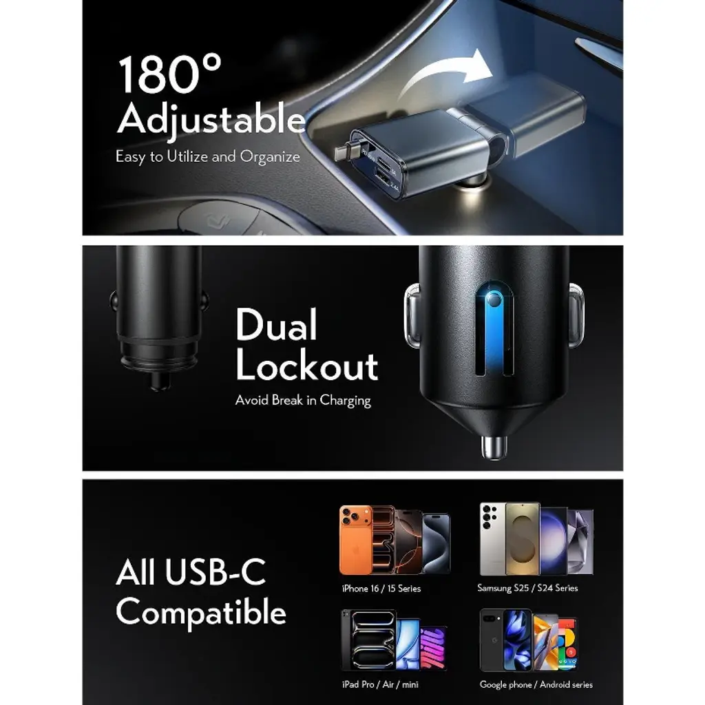 Itopfox Retractable Car Charger With Fast Usb C Charging For Iphone 17 16 15 Pro Max Air, Samsung S25 S24 Ipad Android Devices 57w Ultra-mini Design
