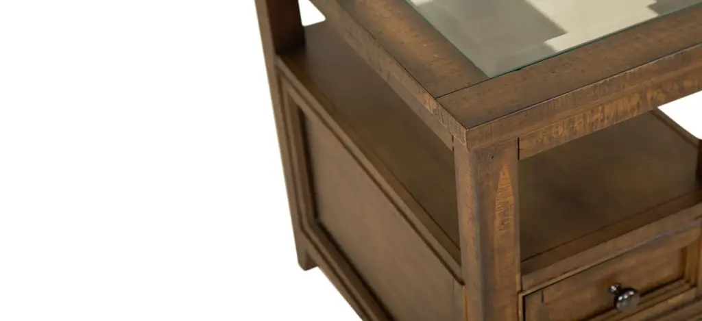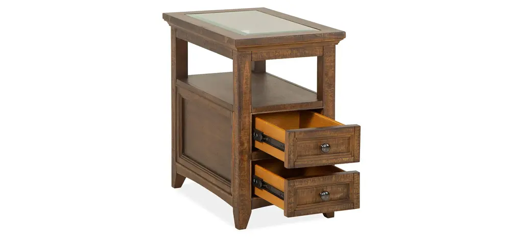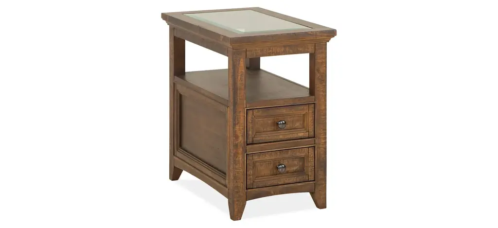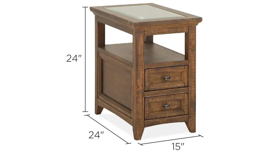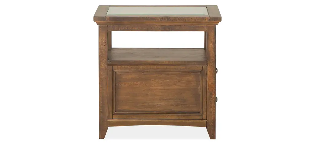 Welcome home to classic styling with the timeless Ivy Ridge chairside table. Its easygoing style comes to life in an alluring toasted nutmeg finish accented with stunning aged bronze hardware. Offering storage this table makes it easy to keep your living space tidy and organized. With handsome detailing and thoughtful features, Ivy Ridge chairside table makes creating a beautiful home a breeze.