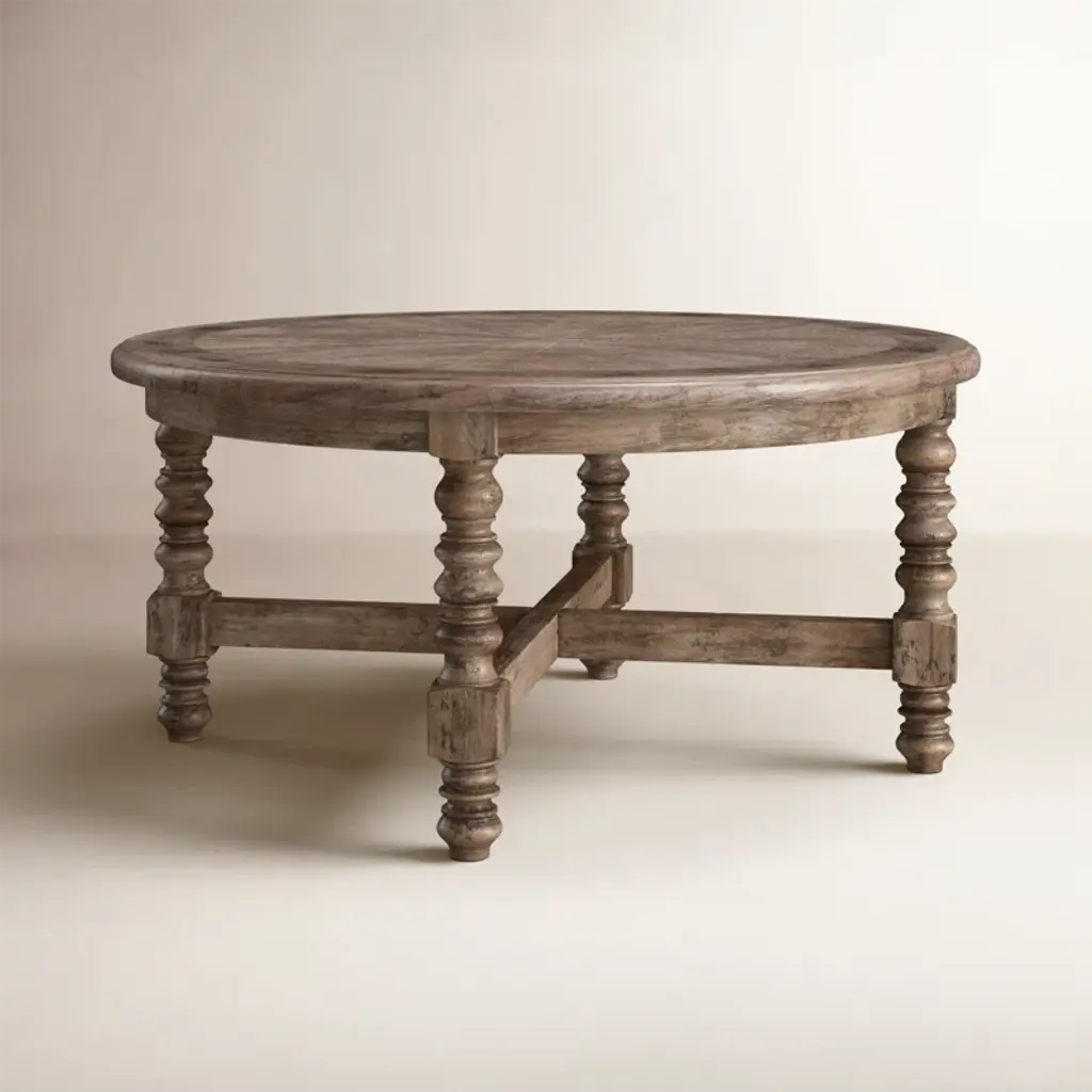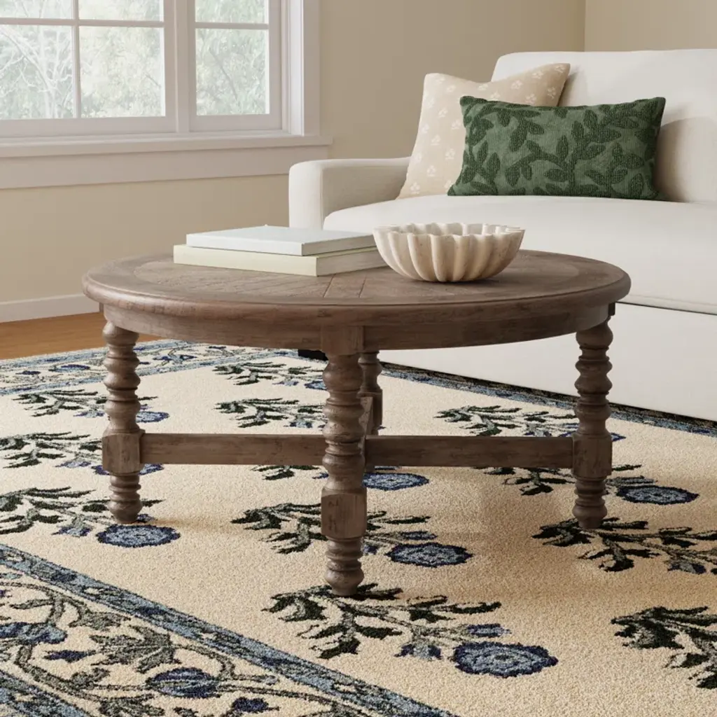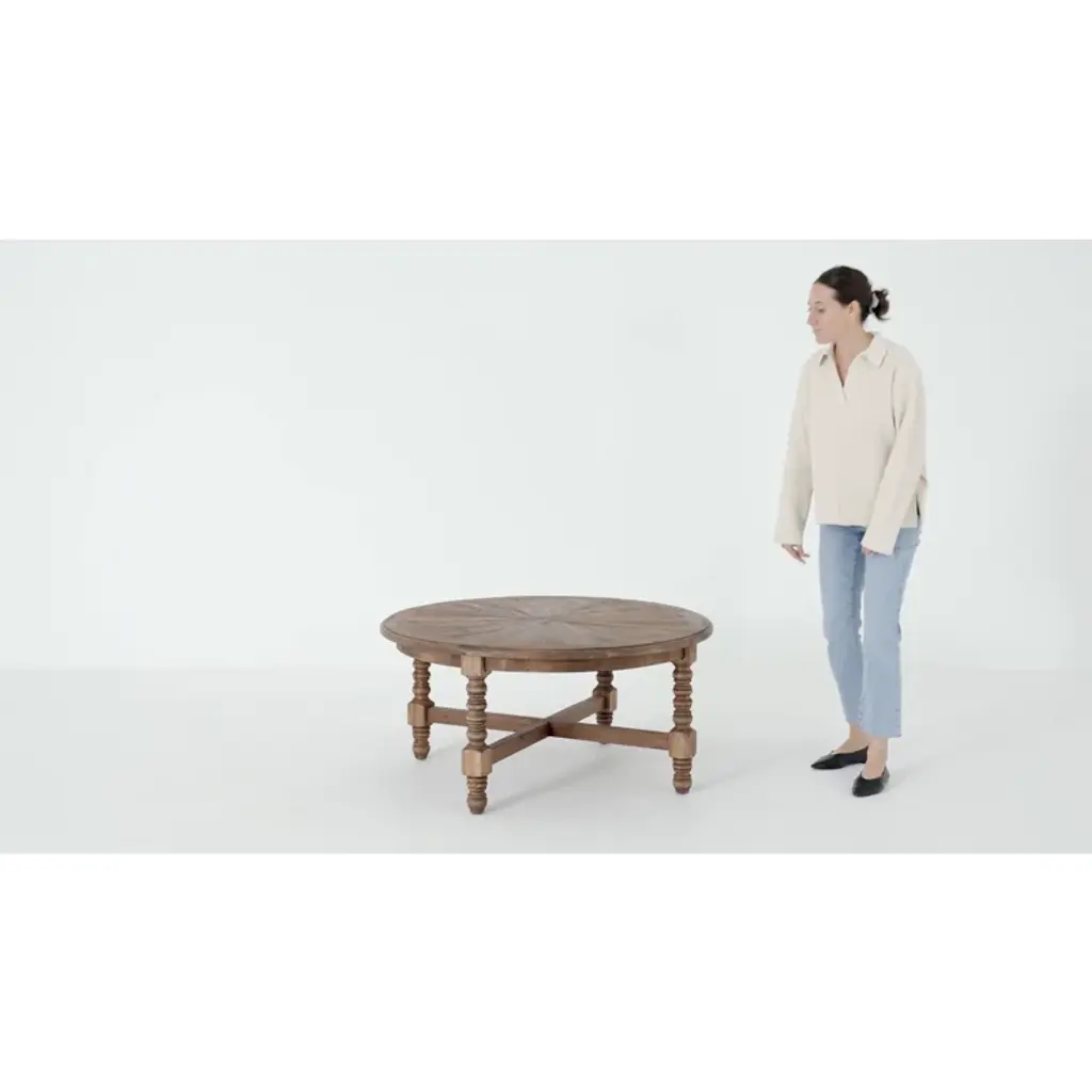 This round coffee table is made from solid fir wood with a warm brown finish that's heavily distressed for a rustic feel. It stands on traditional turned legs and is supported by an X-shaped base for extra stability. The circular table top provides ample space for various items – from remotes and magazines to trays and décor. We love a round table as it brings everyone face-to-face and encourages good conversation.