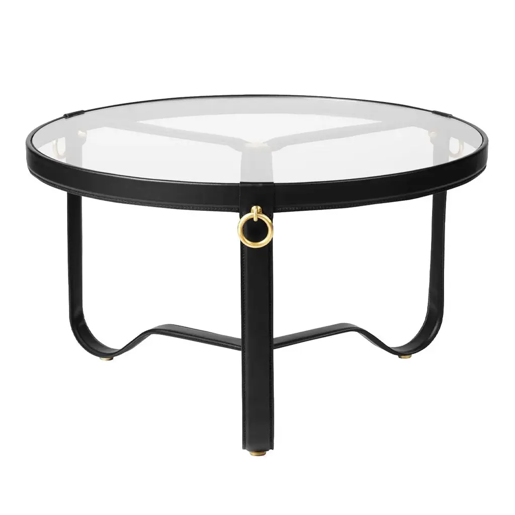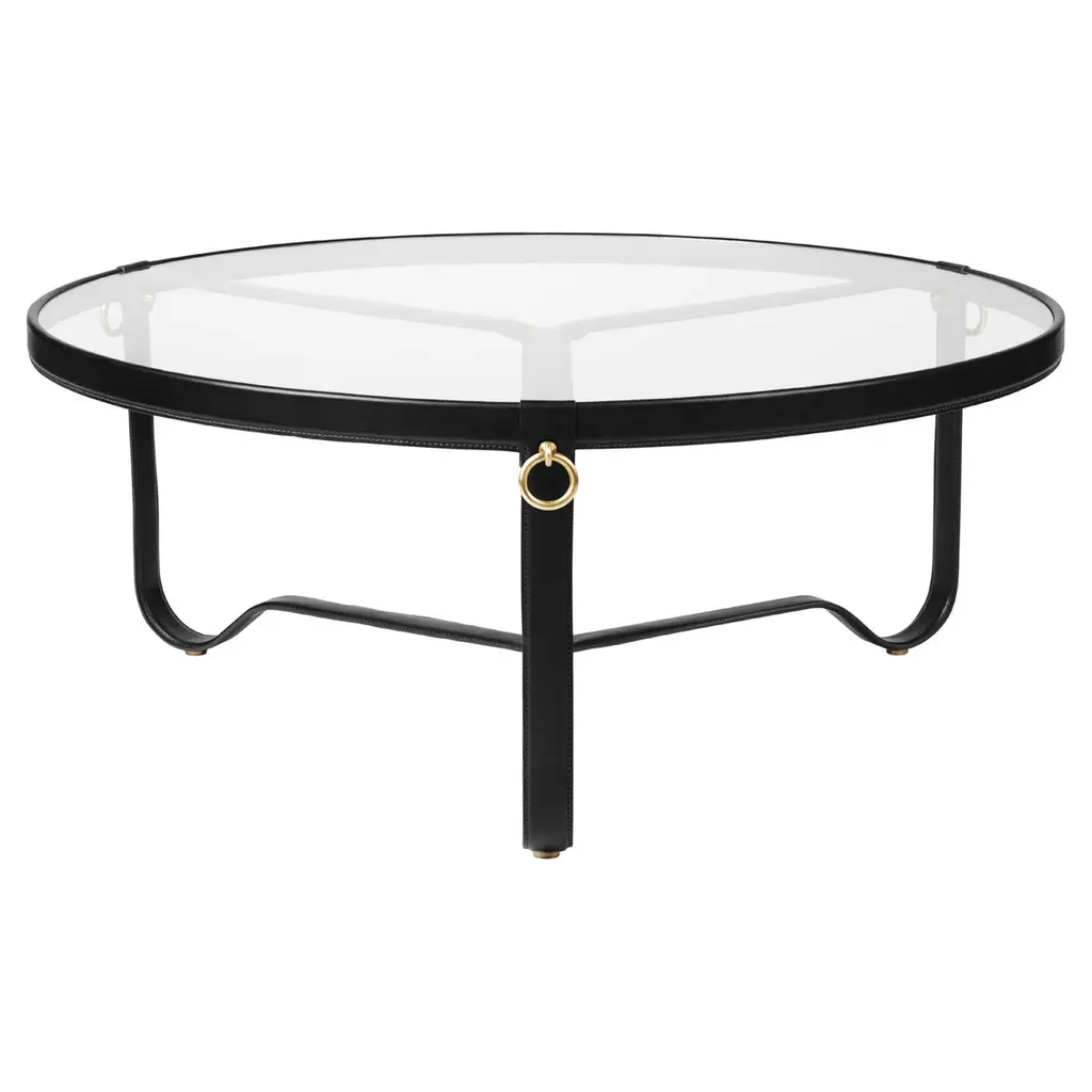 Jacques Adnet 'Circulaire' Glass and Black Leather Coffee or Side Table for GUBI.Originally designed by Jacques Adnet in the 1950s, this incredibly refined coffee table is executed in lightweight glass table top with a hand-made full-grain aniline leather rim with gilded brass accents, a characteristic equestrian detail of the famed French designer who began his career designing for Hermès. The glass table top is placed on three curved metal legs, elegantly meeting in the middle of the table.Price is per item. Available in unlimited quantities in two sizes and three leather options; cream leather is only available in the larger size. This listing is for the smaller sized 'Circulaire' coffee table in black leather.In-stock lead-time 2-3 weeks, currently for the large brown leather variant. Other variants or out of stock can take 8 weeks or longer. Please note inventory stock can change at any time. Kindly inquire prior to placing time-sensitive orders.French designer Jacques Adnet (1900 - 1984) was an architect and Art Deco Modernist designer and an icon of French Modernism. In 1925, Jacques Adnet was recognized as one of the most promising young designers at both the Salon d'Automne and Les Expositions des Arts Décoratifs.Made to order. All sales are final.