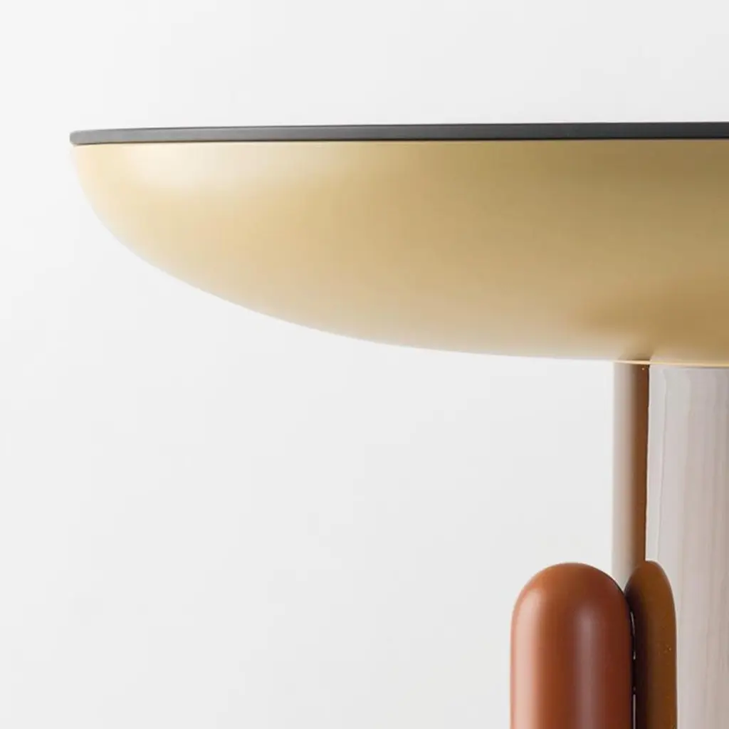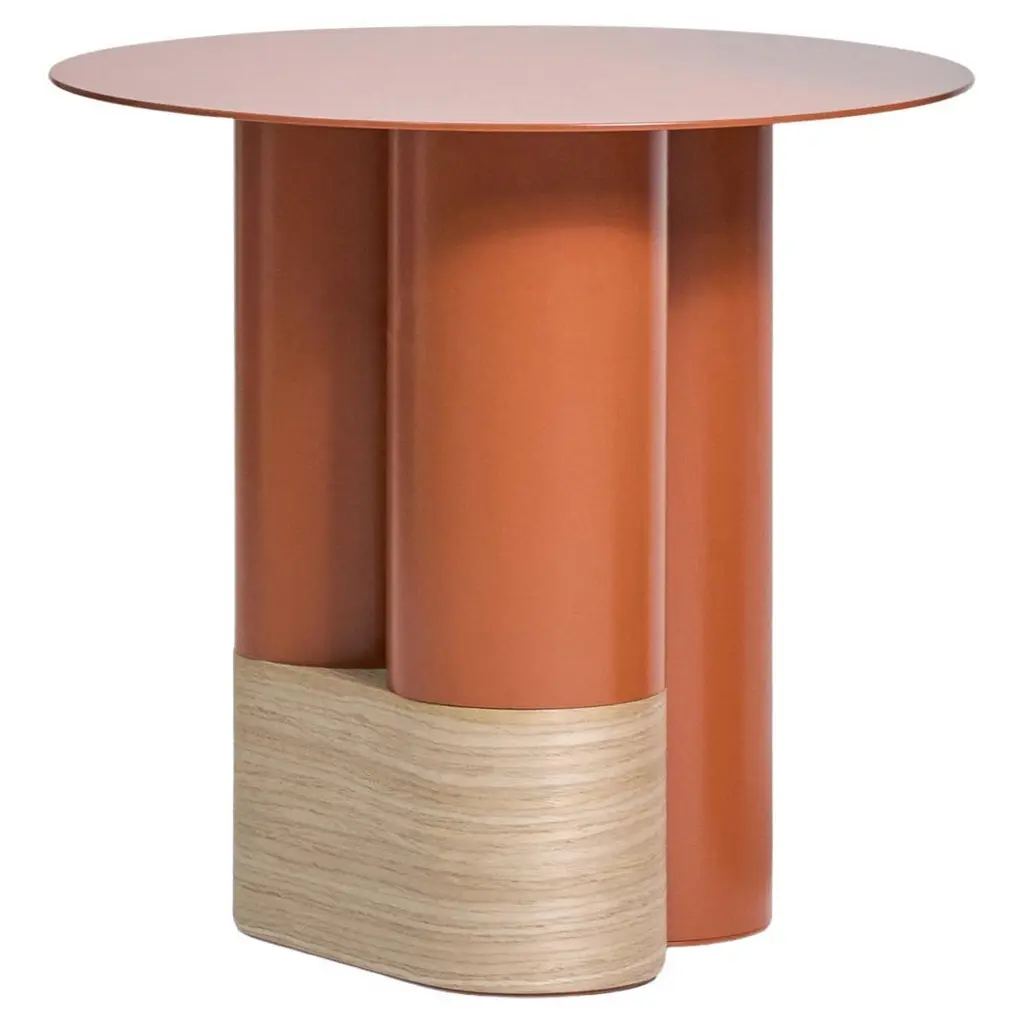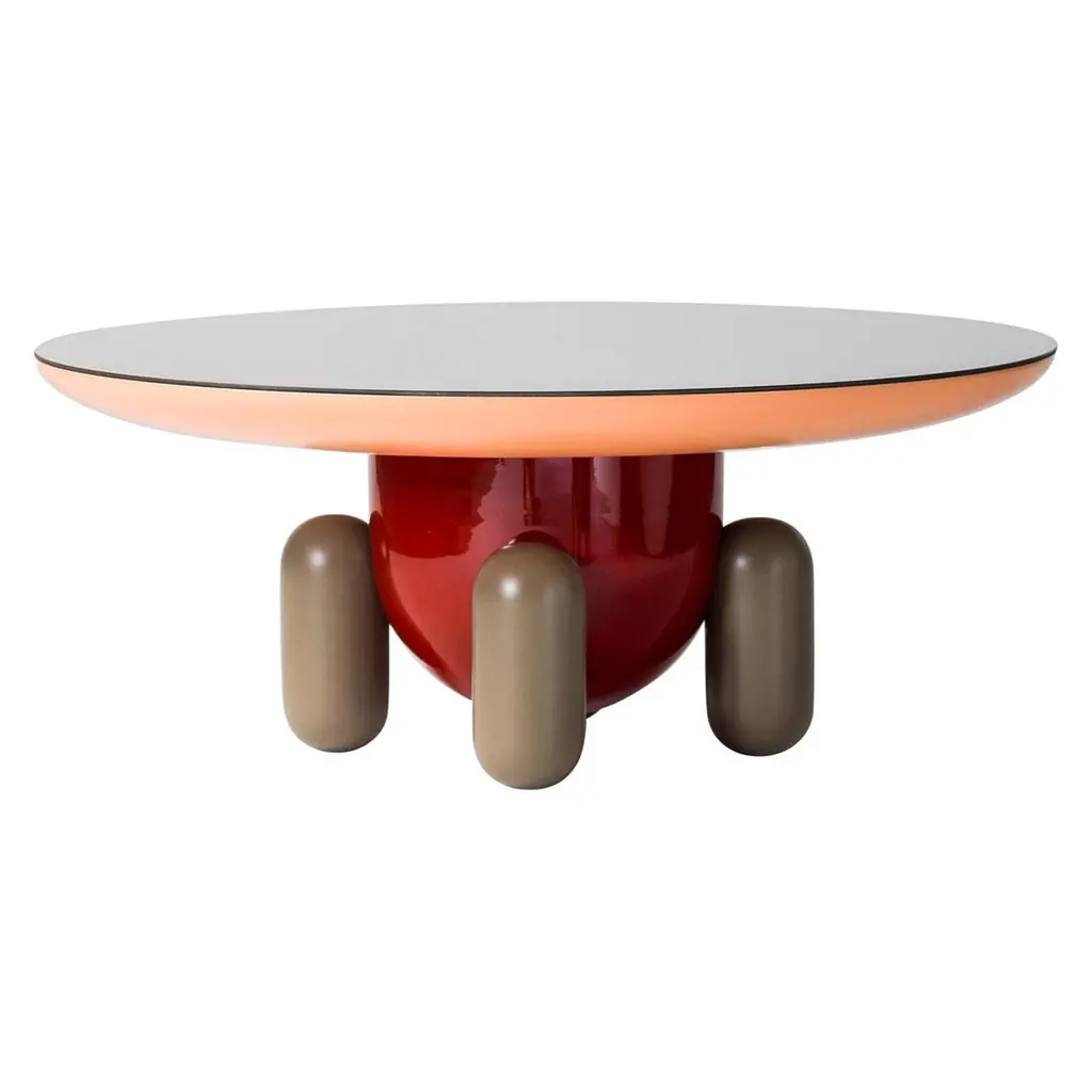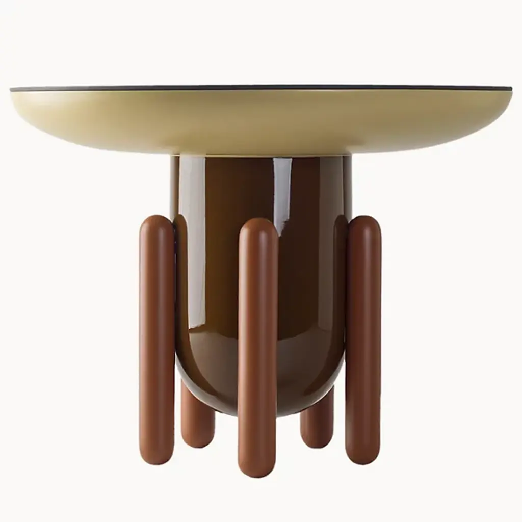 Multicolor explorer #02 tableDesign by Jaime Hayon, 2019Manufactured by BD Barcelona.Laquered fibreglass body. Solid turned wooden legs and lacquered. Painted glass table top.Measure: 60 Ø x 46 cm- Glass: RAL 7021- Top: RAL 1001 mate- Middle: RAL 8011 gloss - Legs: RAL 8004 mate.