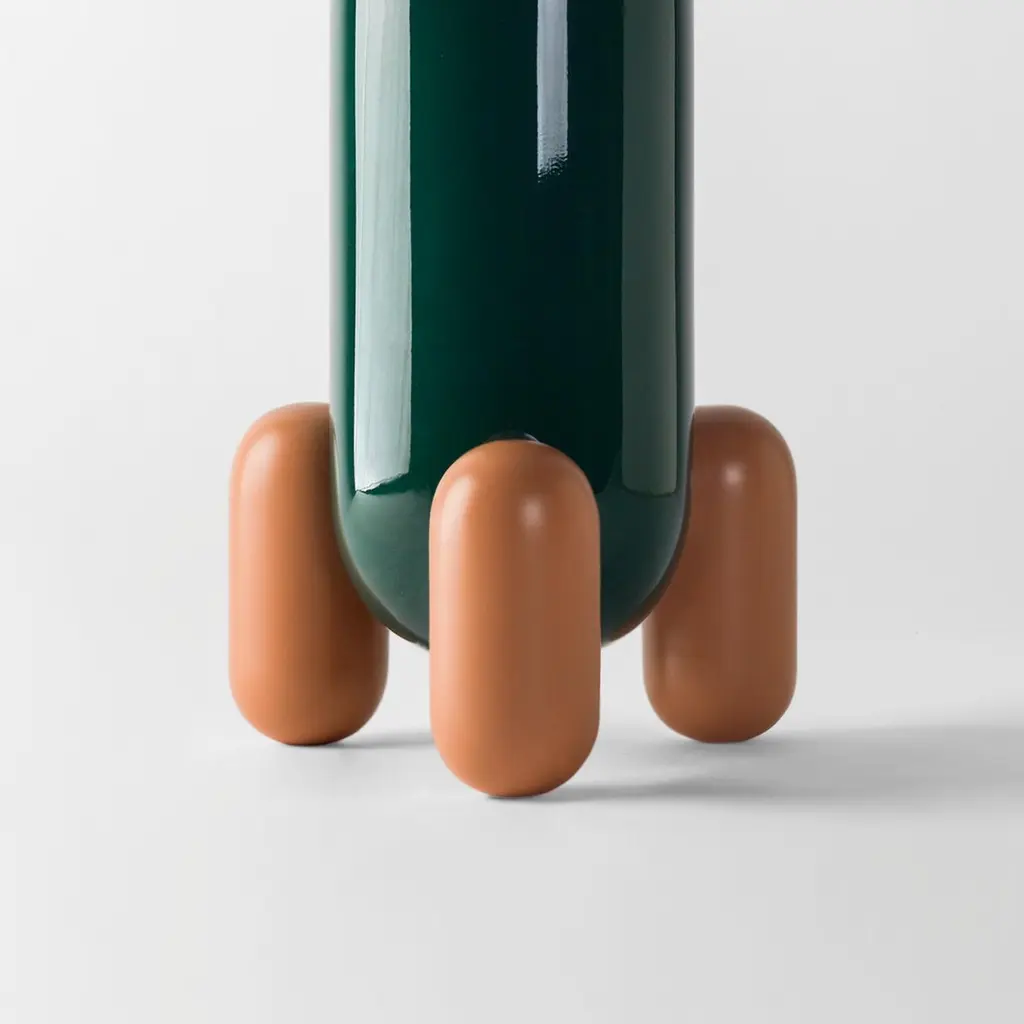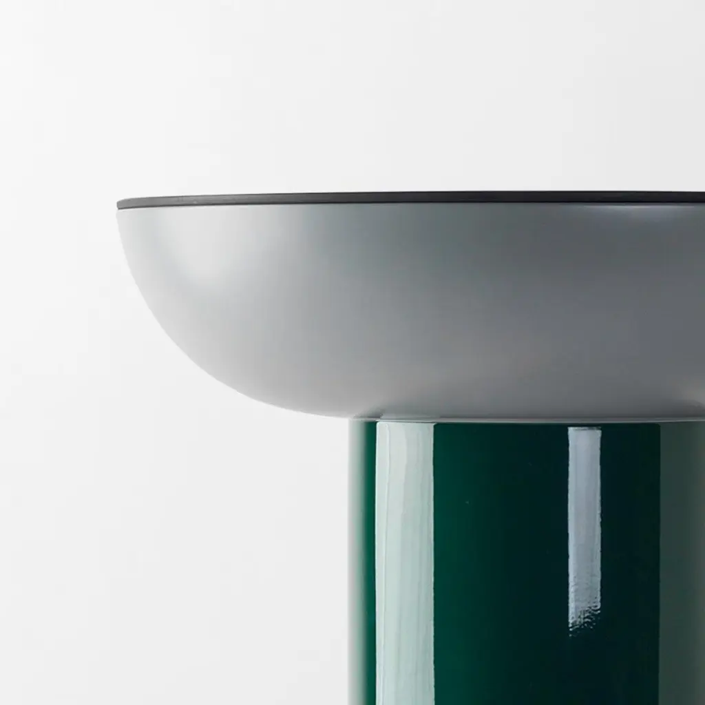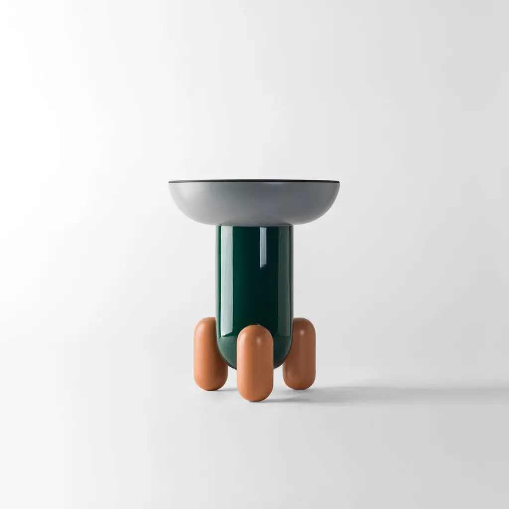 Multi-color explorer #01 tableDesign by Jaime Hayon, 2019Manufactured by BD Barcelona.Lacquered fiberglass body. Solid turned wooden legs and lacquered. Painted glass tabletop.Measures: 40 Ø x 50 cm- Glass: RAL 7021- Top: RAL 6005 mate- Middle: RAL 7001 gloss- Legs: RAL 3012 mate.