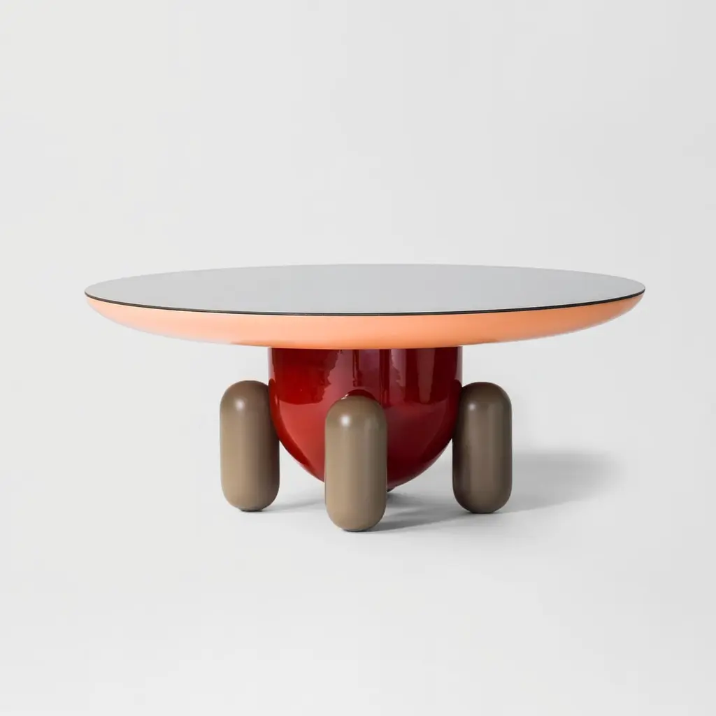 Multi-color explorer #03 tableDesign by Jaime Hayon, 2019Manufactured by BD Barcelona.Lacquered fibreglass body. Solid turned wooden legs and lacquered. Painted glass tabletop.Measures: 100 Ø x 42 cm- Glass: Ral 7021- Top: Ral 3012 Mate- Middle: Ral 3011 Gloss- Legs: Ral 7006 Mate.