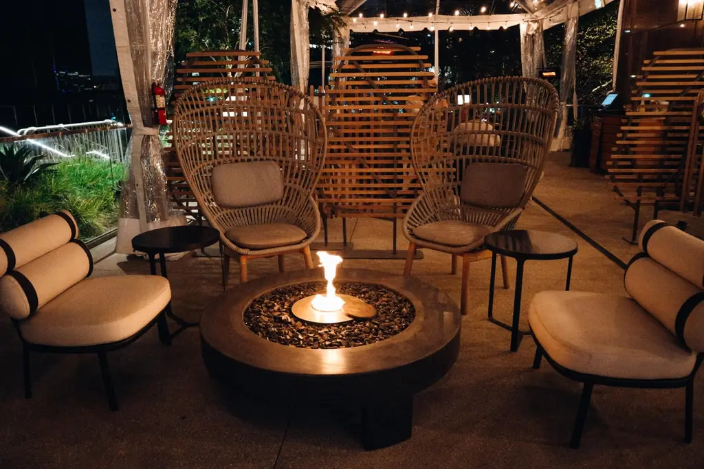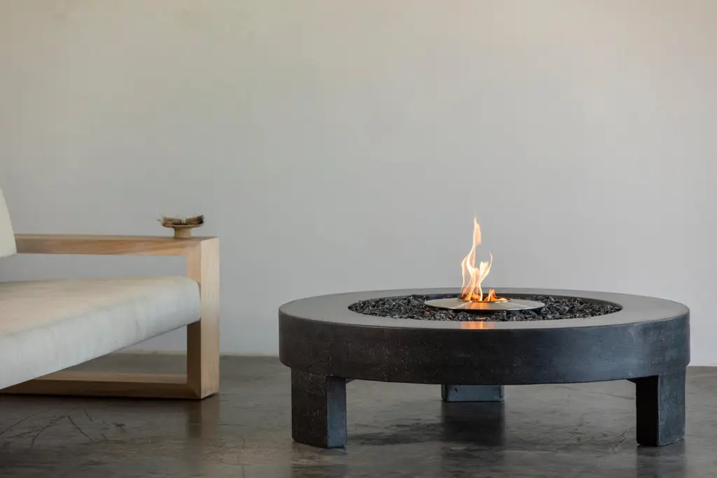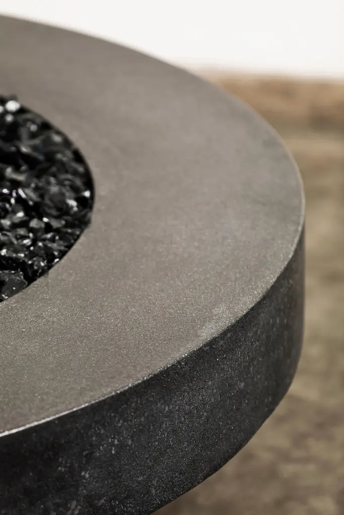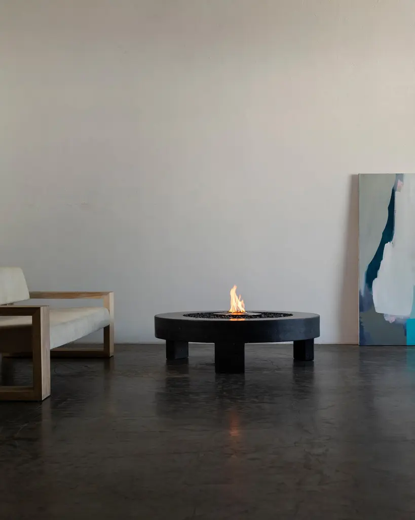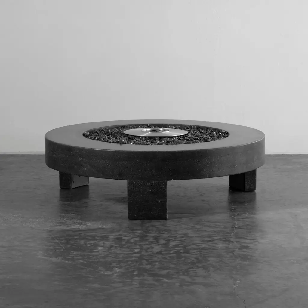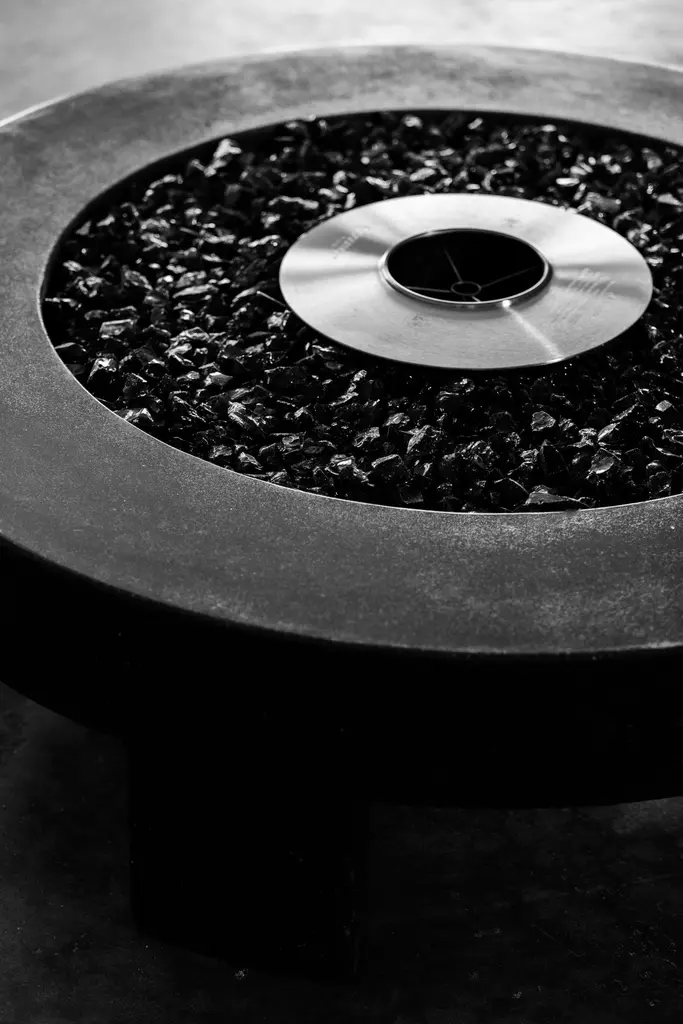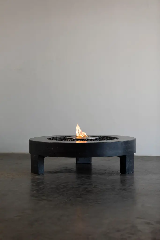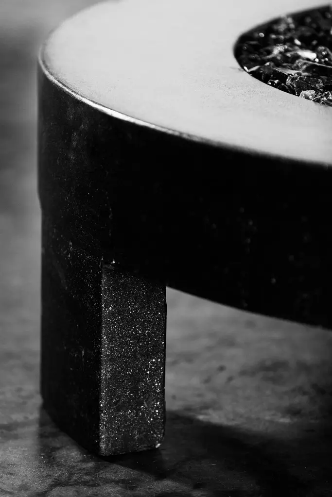 James de Wulf's 3-Legged Concrete Fire Table is the second design in a series of three different styles. The unique and unexpected 3-legged design is made to look asymmetrical from all different angles. Table is polished and sealed for a soft lustre. Ethanol burning kit sits in lava rock, topped with high grade black glass rock. Grounded warmth and beauty.Intended for outdoor use.