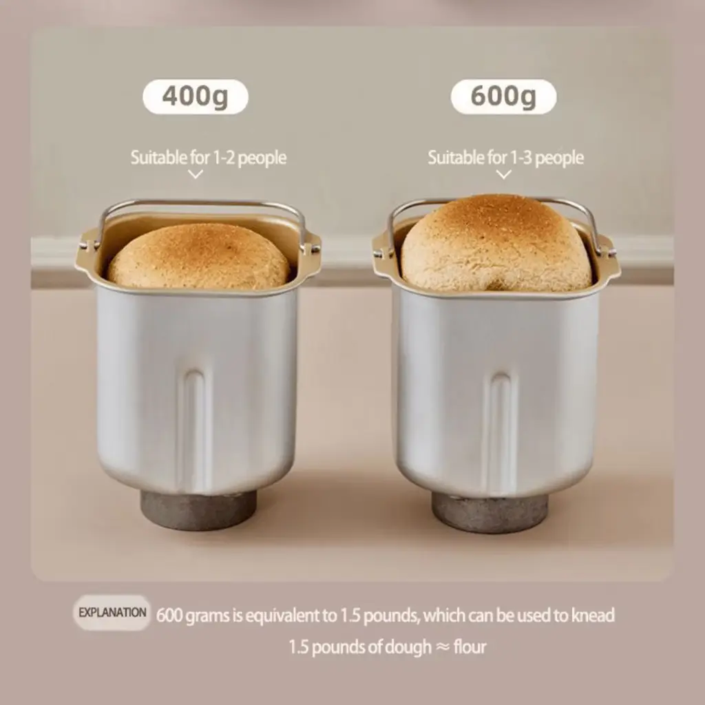 This bread maker features a fingerprint-resistant 304 stainless steel shell, a 2.8-inch backlit LCD display, and mechanical silver strip buttons with laser-engraved patterns that never fade, plus a PC+tempered glass transparent window for easy monitoring. It offers 1.0Lb, 1.5Lb, and 2.0Lb capacities, with a removable aluminum alloy inner pot coated in non-stick Teflon (easy to clean, avoid scratching with hard/sharp objects), and food-grade 304 stainless steel mixer parts for durability. Powered by an electric heating pipe, it includes overheat protection (via built-in temperature sensor), a wear-resistant rubber pure copper power cord, and 19 preset programs covering kneading, stirring, baking, automatic sprinkling, and more—plus 15-hour delay timing and a motor cooling system. Its non-slip base ensures stability, blending functionality with reliable design for home baking.