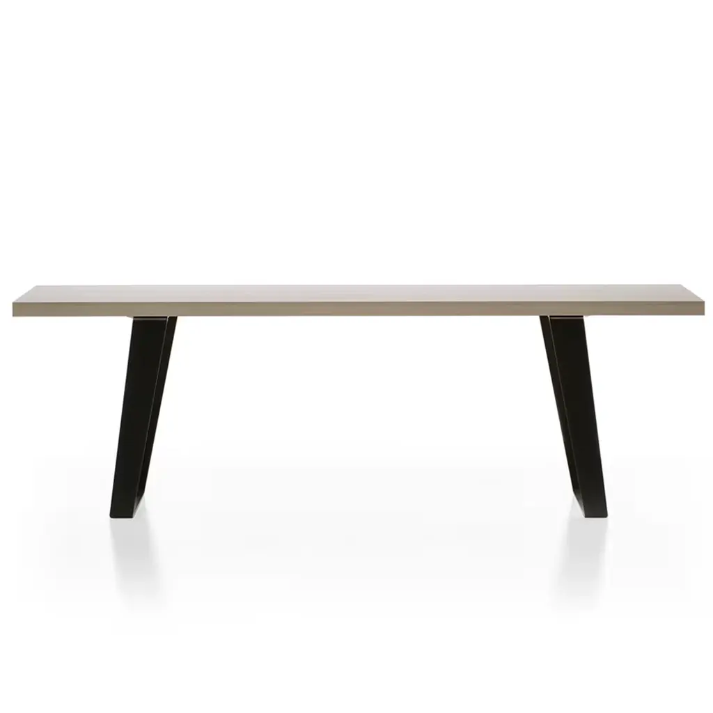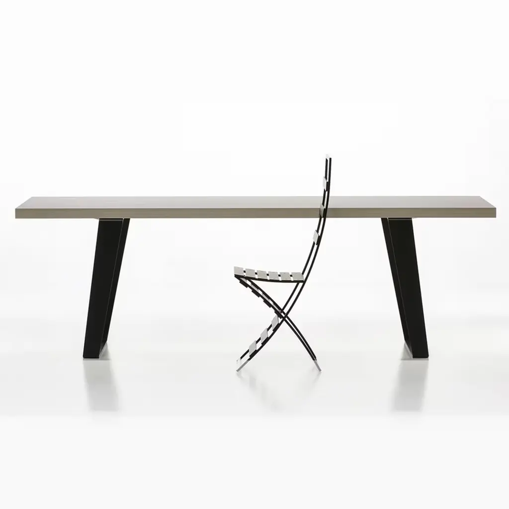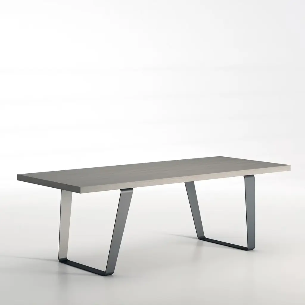 Franco Poli designed this rectangular table as a versatile, dynamic design that will fit in domestic or professional contexts, alike. Here offered in an elegant Canadian durmast finish, the rectangular top is raised on a sleigh steel base varnished with a special embossed effect. Please consult the Concierge for the 210cm-long version and all the available finishing variants.