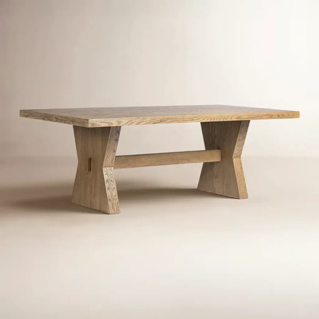 Inspired by European antiques, a clean, elongated dining surface and bowtie-shaped legs serve plenty of presence. A single stretcher adds a traditional feel to this refreshed altar table made from solid oak.