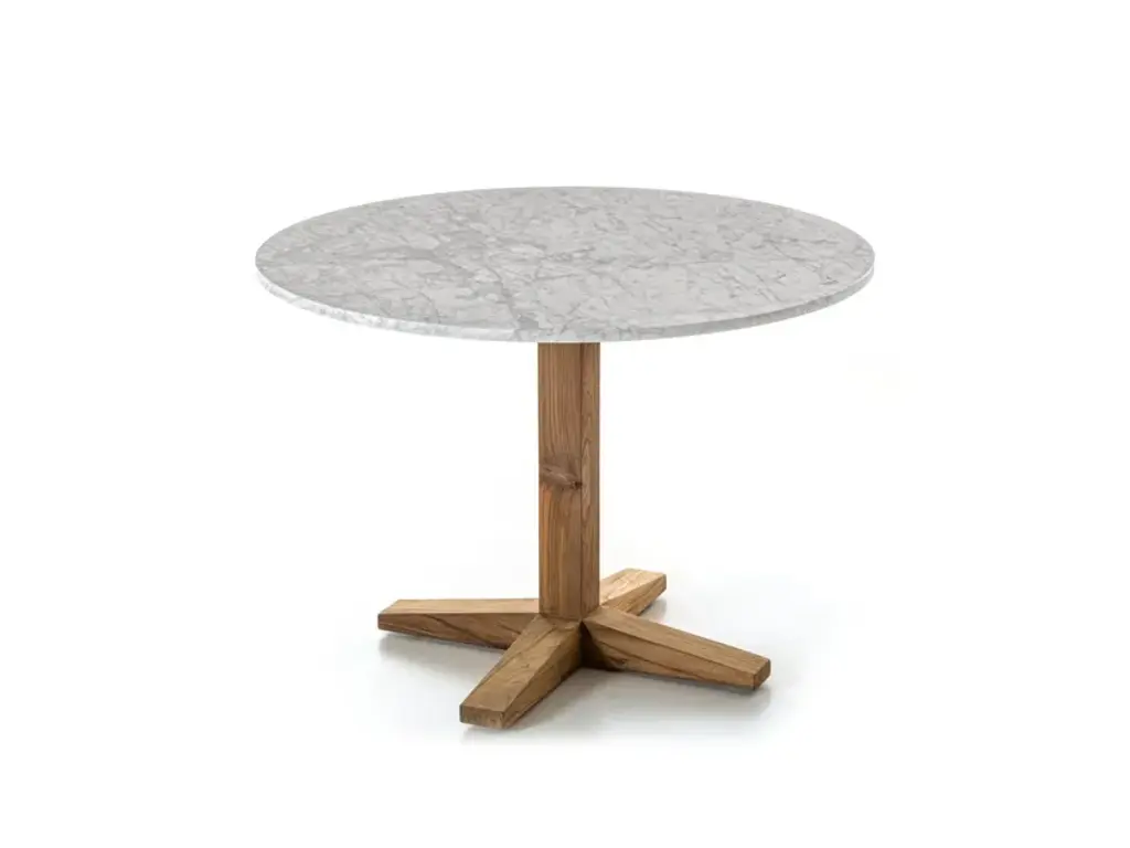 Table in colonial style of exotic inspiration, Jeko 35 has central leg and base made of ECOTeak, a material coming from the reuse of recovered beams and teak elements that have been repaired with recycled wood, assembled and polished to highlight the original veins.‎ It is embellished with a white Carrara marble top, so as to create a product that plays on the visual contrasts of the two different materials.‎The allure of an exotic mood is the inspiration for the Jeko collection.‎ The Jeko tables, sofas, and armchairs feature a frame in ECOTeak, a material obtained from recycled teak beams and elements recovered from the demolition of traditional wooden homes on the island of Java, Indonesia, authorised by local authorities.‎ The recovered elements are cut to size, repaired with recycled wood, assembled and sanded to highlight the original grain, and finally hand-polished with hemp cloths and shavings.‎ Its curvy profile is completed by soft, cosy cushions.‎