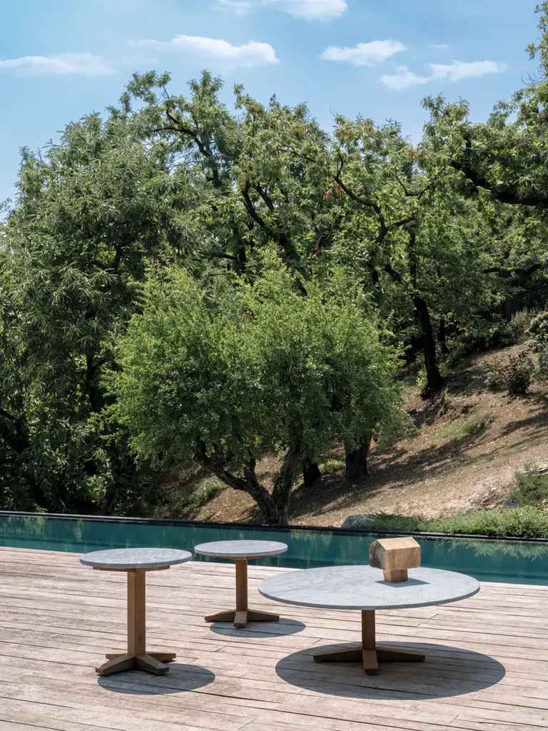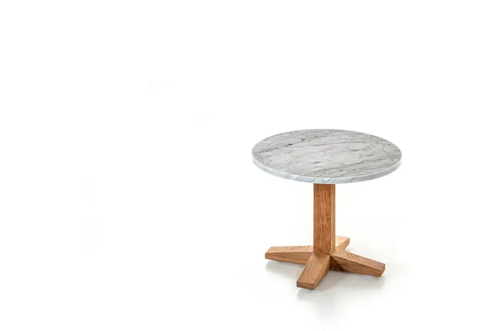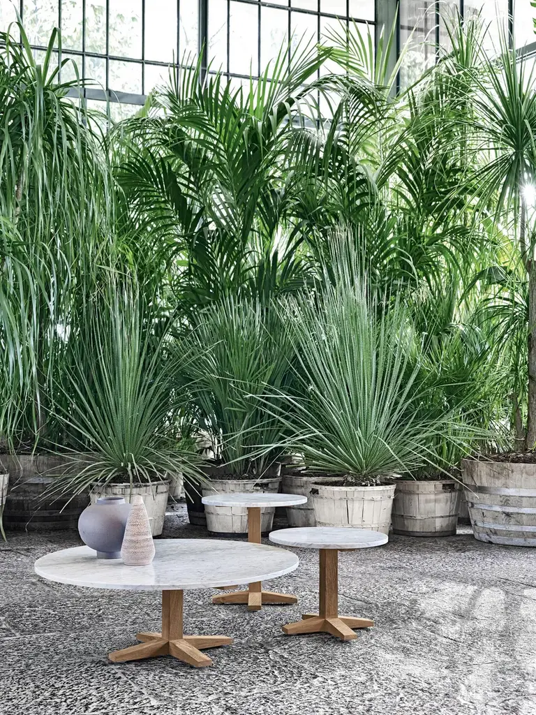 Family of side tables in colonial style of exotic inspiration, Jeko 40/41 have central leg and base made of ECOTeak, a material coming from the reuse of recovered beams and teak elements that have been repaired with recycled wood, assembled and polished to highlight the original veins. They are embellished with a white Carrara marble top, so as to create a product that plays on the visual contrasts of the two different materials.The allure of an exotic mood is the inspiration for the Jeko collection. The Jeko tables, sofas, and armchairs feature a frame in ECOTeak, a material obtained from recycled teak beams and elements recovered from the demolition of traditional wooden homes on the island of Java, Indonesia, authorised by local authorities. The recovered elements are cut to size, repaired with recycled wood, assembled and sanded to highlight the original grain, and finally hand-polished with hemp cloths and shavings. Its curvy profile is completed by soft, cosy cushions.