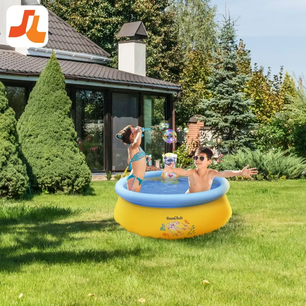 Enjoy hours of refreshingly fun family activity in this swimming pool with super easy set up (no tools needed). Just fill the upper ring with air and then fill the pool with water. This JLeisure Bee Spray Swimming Pool is ready for water in 10 minutes! This above-ground swimming pool is great for kids looking to cool off on a warm summer day. These inflatable pools drain conveniently. The durable sidewalls are made with 3 separate layers of material for extra strength and durability. This pool will resist even the roughest treatment. The drain plug accepts a garden hose to drain water away from the pool area as desired. This inflatable above ground pools is much easier to disassemble than any rigid steel-walled pool, too! Family members of all ages and sizes can enjoy a soak in the JLeisure 5-foot x 16.5-inch Bee Spray Above Ground Inflatable Round Swimming Pool! Whether you need a little extra cooling off on a hot summer day or a way for your kids to enjoy a swimming pool in the comfort of your own backyard, the JLeisure Bee Spray pool is a great option for both.