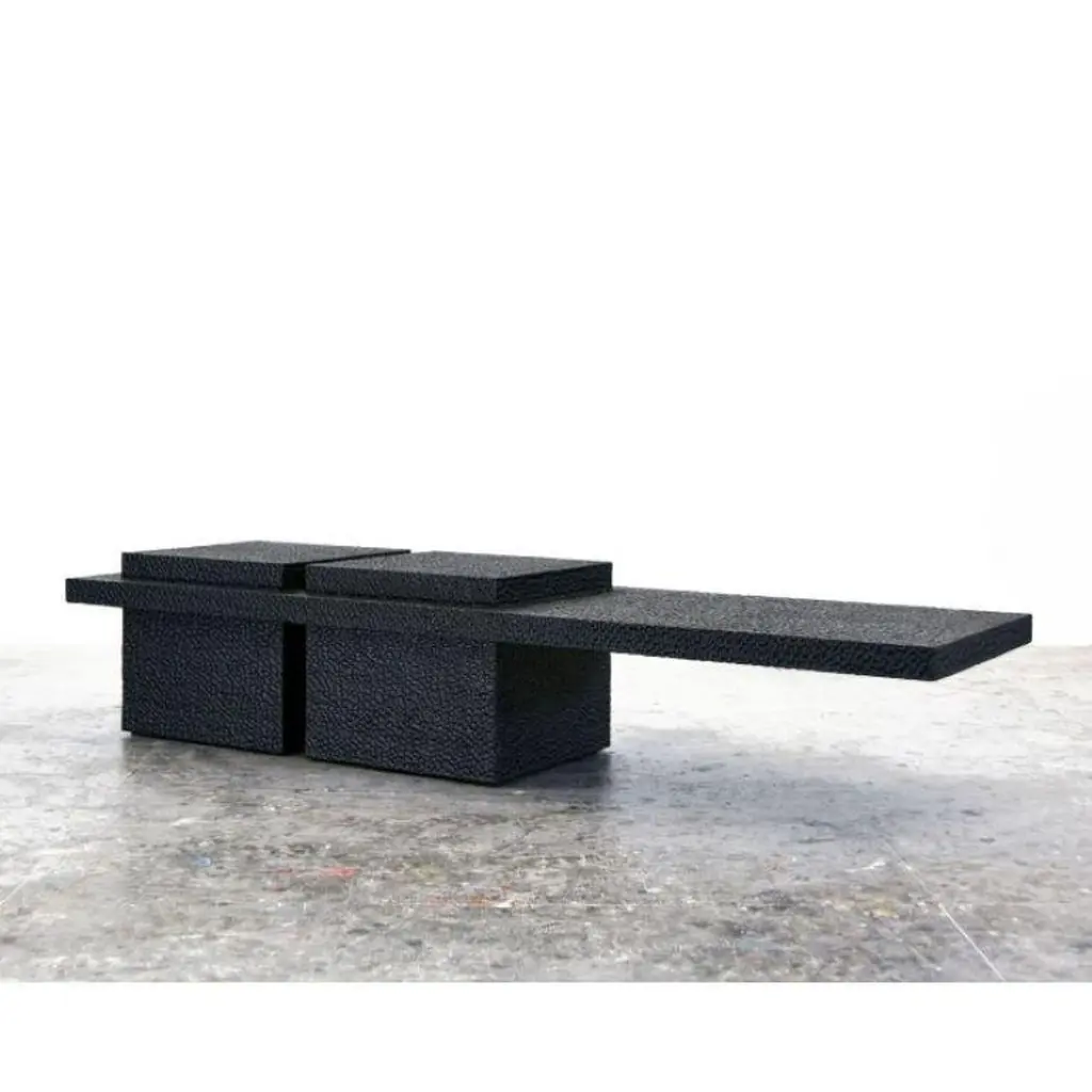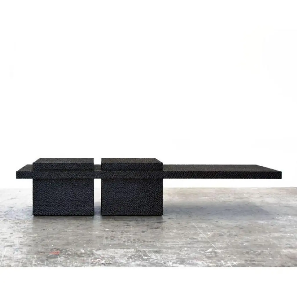 This solid oak table from John Eric Byers merges modern, simplified geometries with traditional craft, painstakingly hand carved and lacquered with a distinctive textured pattern to give a maximalist finish to a minimalist silhouette. Exclusive to Twentieth.John Eric Byers is an artist/designer/craftsman who works exclusively with wood. The wood medium to Byers is like clay to a potter; he transforms the material through exceptional care and thoroughness, hand-tooling the surface and creating something completely unique. His works succeed due to somewhat of a contradiction. While the forms are strikingly geometric and minimal, they are contrasted with the superb craftsmanship and intricacy he brings to the material's outer surface. As noted by Grace Glueck in the New York Times, "The carved, patterned surfaces add considerable interest to his simplified forms, as does his exquisite attention to detail." A former student of Wendell Castle, John's work is guided by purity of form, structure, and surface texture, as well as a great respect for the materials he works with.John Eric Byers is an American artist with works in the permanent collections of the Museum of Arts and Design in New York and the Smithsonian American Art Museum in Washington, D.C. Numerous awards include the Louis Comfort Tiffany Foundation Award and inclusion in the Smithsonian's Archives of American Arts.John Eric Byers, "V4", Cabinet.