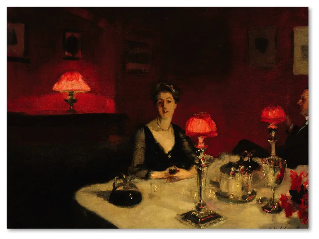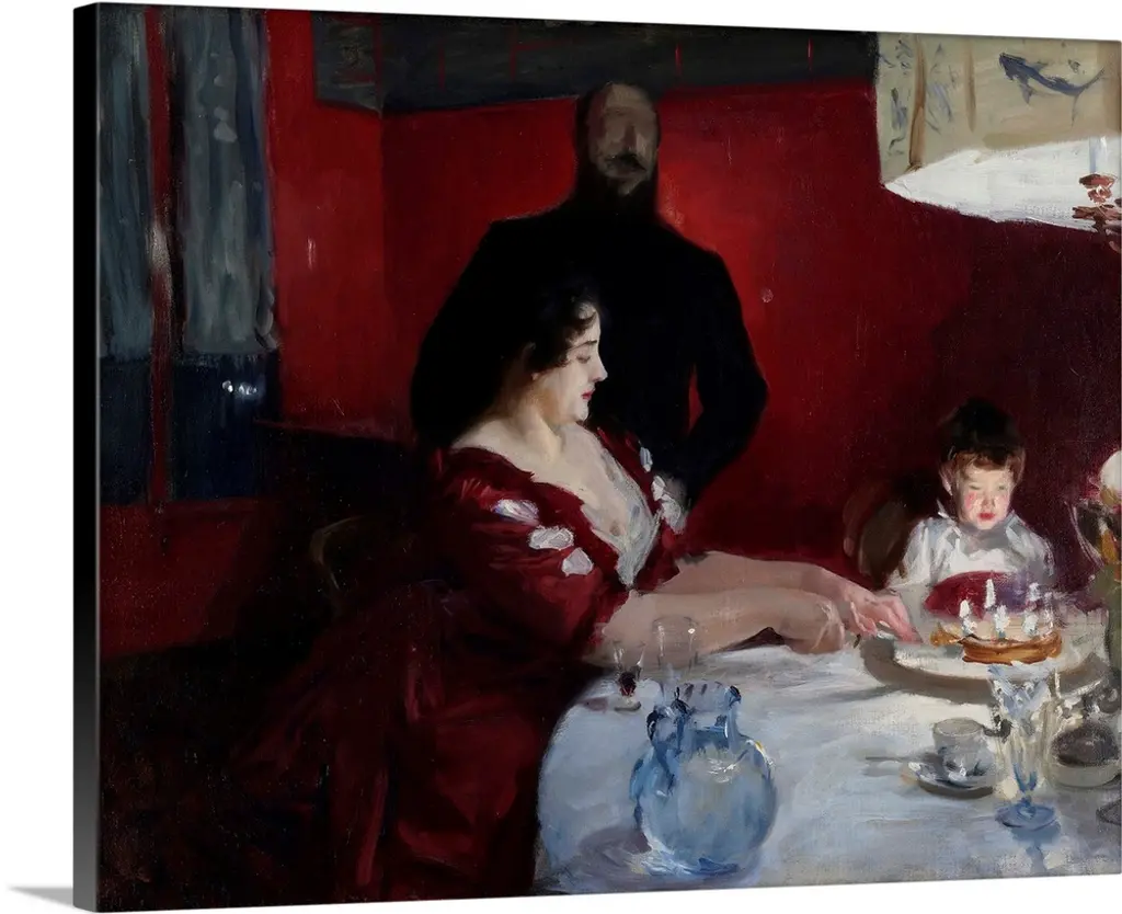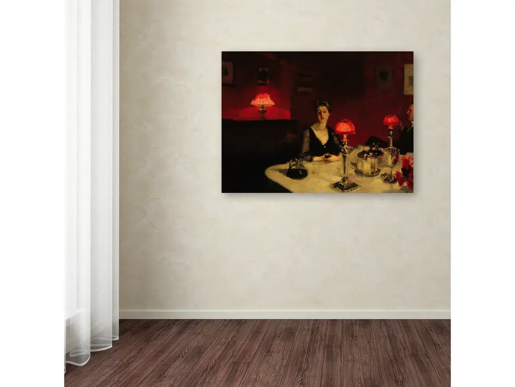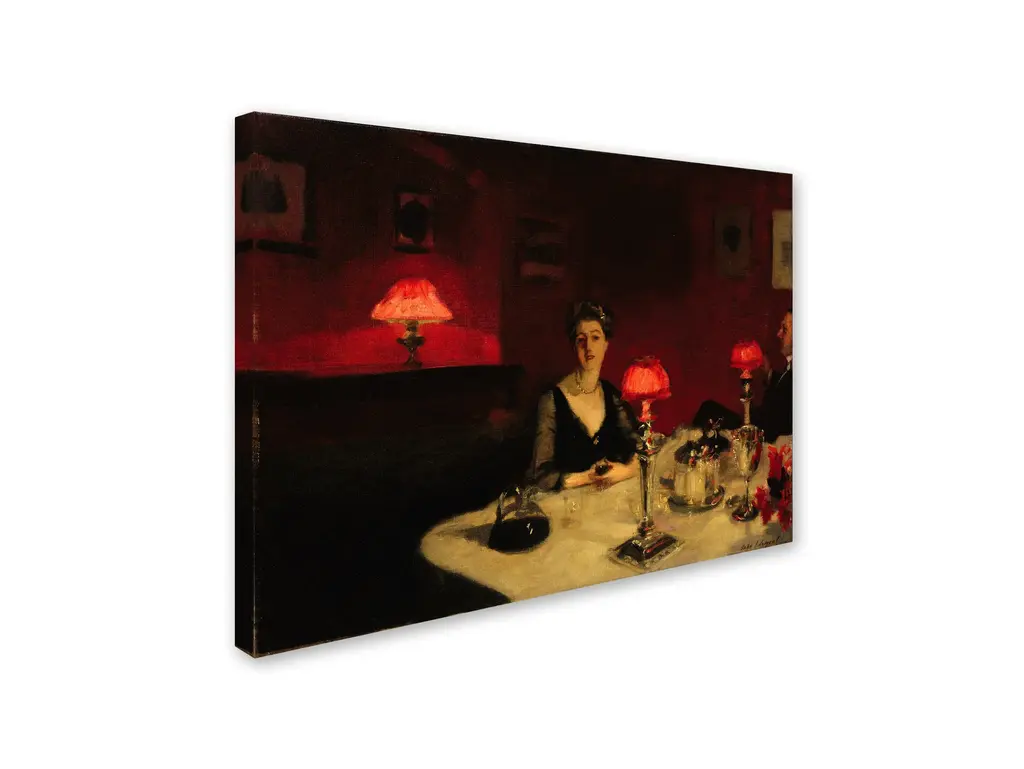 Artist: John Singer SargentSubject: PeopleStyle: TraditionalProduct Type: Gallery-Wrapped Canvas ArtMade in USAThis ready to hang, gallery-wrapped art piece features a woman eating dinner at a dark table by herself.John Singer Sargent, born 1856 and died 1925, was an American artist, considered the "leading portrait painter of his generation". From America, Sargent was trained in Paris and painted around 900 oil paintings in his life time.Giclee (jee-clay) is an advanced printmaking process for creating high quality fine art reproductions. The attainable excellence that Giclee printmaking affords makes the reproduction virtually indistinguishable from the original piece. The result is wide acceptance of Giclee by galleries, museums, and private collectors. Gallery wrap is a method of stretching an artist's canvas so that the canvas wraps around the sides and is secured a hidden, wooden frame. This method of stretching and preparing a canvas allows for a frameless presentation of the finished painting.