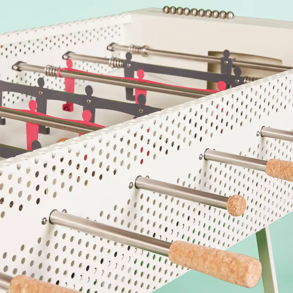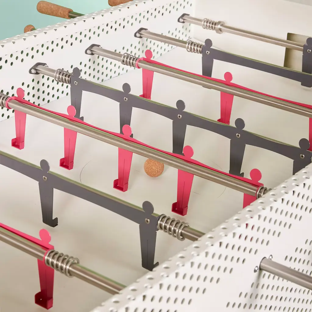 The Joie table football combines an elegant white perforated sheet metal body with gray and fuchsia players. It features meticulous details including cork grips and ball for enhanced comfort and tactile experience. Constructed entirely from metal with stainless steel components, the table stands on sleek legs offering stability and modern appeal. An outdoor version is also available, making it a refined choice for design-conscious gaming spaces. Other color options are available in the Artemest catalog. Please contact the Concierge for more details.