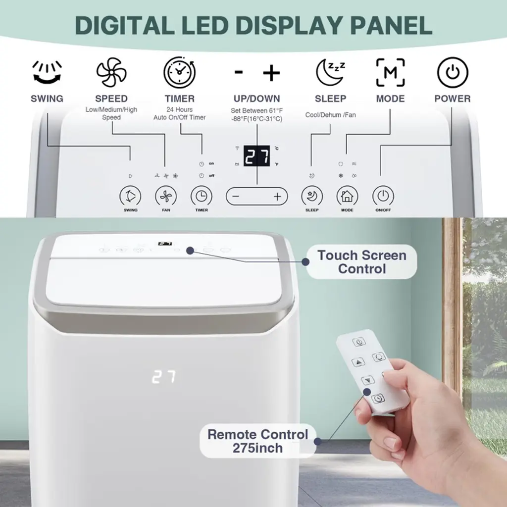 Stay cool and comfortable all summer long with this 12,000 BTU Portable Air Conditioner. Designed for spaces up to 550 sq. ft., this freestanding AC unit delivers fast, powerful cooling with wide-angle airflow and quiet operation. Whether you're in a bedroom, living room, office, or RV, enjoy the 3-in-1 functionality¡ªcooling, fan, and dehumidifier modes¡ªto meet your specific needs. The built-in sleep mode and 24-hour timer offer personalized comfort while saving energy. With an easy-to-clean washable filter, remote control, and LED display panel, operation is effortless. Thanks to its compact design, 360¡ã caster wheels, and integrated handles, you can move it wherever comfort is needed. The included window kit ensures hassle-free installation on most window types.