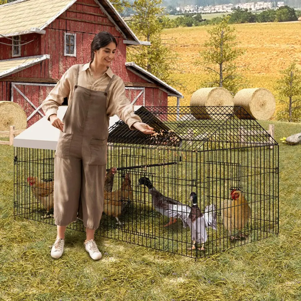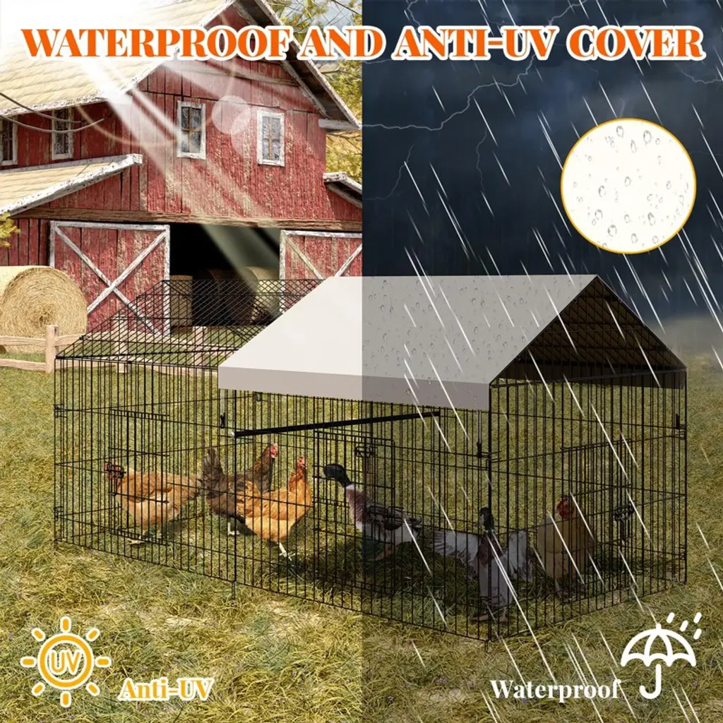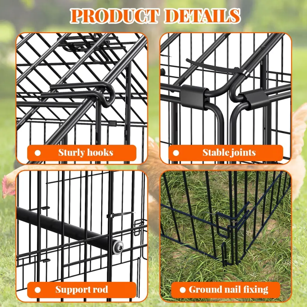 Experience peace of mind with this durable and spacious metal chicken coop designed for versatile use in your backyard. Featuring a sturdy epoxy coating, it resists rust and corrosion, while ground nails ensure excellent stability in any weather. The walk-in design offers ample activity space for chickens, ducks, rabbits, and other small animals. The waterproof and UV-protective cover keeps your pets sheltered from the elements. With easy assembly and multiple access doors, this coop is an ideal solution for any small animal owner.
