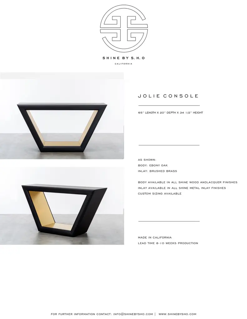 JOLIE CONSOLE TABLE - Modern White Lacquer Console and Gold Metal InlayThe Jolie Console Table is a stunning piece of furniture that draws inspiration from the elegant and intricate jewelry of the 1960s. It features a hand-carved bull nose detail with a metal inlay, which adds a touch of sophistication and luxury to this console table.This console table is fully custom and made to order in California, ensuring that it is crafted to meet your specific needs and preferences. As shown in Lacquer, the price of the Jolie Console Table is $14,330 as shown. However, please note that the price may vary depending on the size and finish options selected.With its unique and eye-catching design, the Jolie Console Table is sure to make a statement in any room. Whether you're looking for a functional piece of furniture or a statement piece to add to your decor, this console table is the perfect choice. Its hand-carved bull nose detail and metal inlay make it a truly one-of-a-kind piece that you'll treasure for years to come.