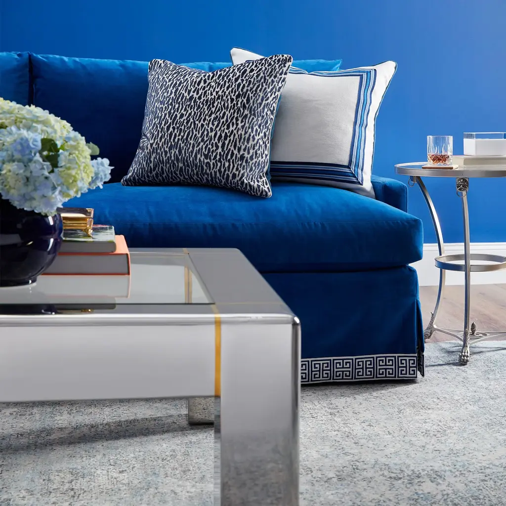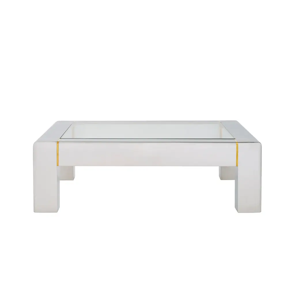 The low profile and sleek stainless steel finish of the Josephine Cocktail Table make it the perfect addition to any modern space. A touch of brass in the trim brings warmth to the design, and the glass top compliments the otherwise substancial frame.The Josephine collection also includes a console table (sold separately). Ships In 4-5 Weeks Glass top Brass trim Polished stainless steel This image is for illustrative purposes only. The colors shown are accurate within the constraints of lighting, photography, and the color accuracy of your screen.