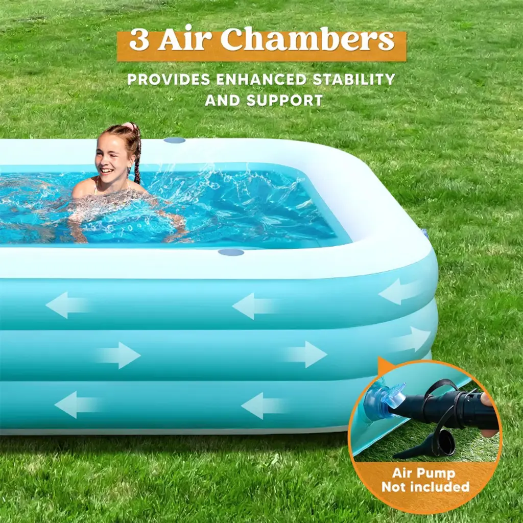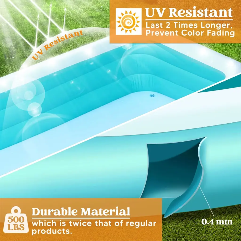Turn your backyard into a summer oasis with our Cyan Family-Sized Inflatable Pool! Make summer memories that last a lifetime with a spacious family pool that comfortably accommodates up to 4 adults and 3 kids. This generous size allows everyone to join in the fun, creating a perfect setting for relaxation and enjoyment. Whether you're swimming, playing games, or just lounging, the family pool offers enough space for everyone to splash around and bond, ensuring unforgettable moments in your own backyard. Keep your family safe while having fun in the sun with our family pool, which is expertly crafted from UV protection material. This innovative design ensures the pool maintains its durability and vibrant colors for longer, even with constant exposure to the sun. The UV-resistant material helps protect both the pool and your skin, offering a safe and lasting pool experience for you and your loved ones. Make the most of your backyard with a family pool that holds up to 370 gallons of water, providing plenty of space for everyone to cool off on hot summer days. With this generous water capacity, the pool transforms your outdoor space into a refreshing haven, perfect for family gatherings, fun-filled afternoons, or relaxing evenings under the stars. It’s the ultimate way to stay cool, have fun, and spend quality time together during the summer months.