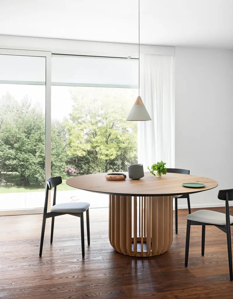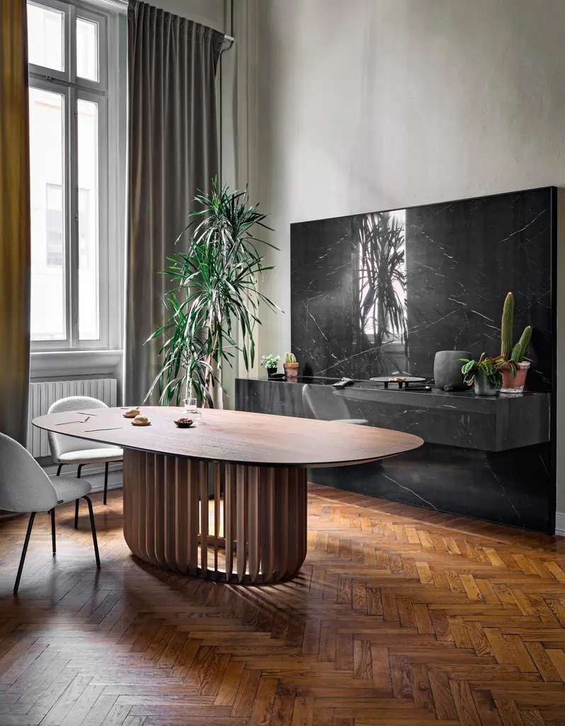 Juice is a monumental table with a meditative air. Its essence lies in the base, where the long wooden legs attach to a ring, encircling it. Juice, a table developed around the balance between filled and empty spaces, creates a sensation of perfect calmness.Additional Information:Top Finishing• Calacatta Black• Ceppo di Gré• Emperador• Statuario White• Tafu• Black Ash• Canaletto Walnut• Flamed Oak• Heat-Treated Oak• Vintage OakLegs Finishing• Black Ash• Canaletto Walnut• Flamed Oak• Heat-Treated OakDIMENSIONS:Ø 180 x 75 H cm