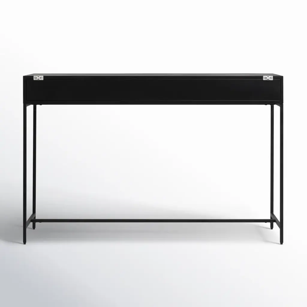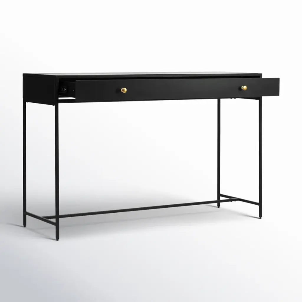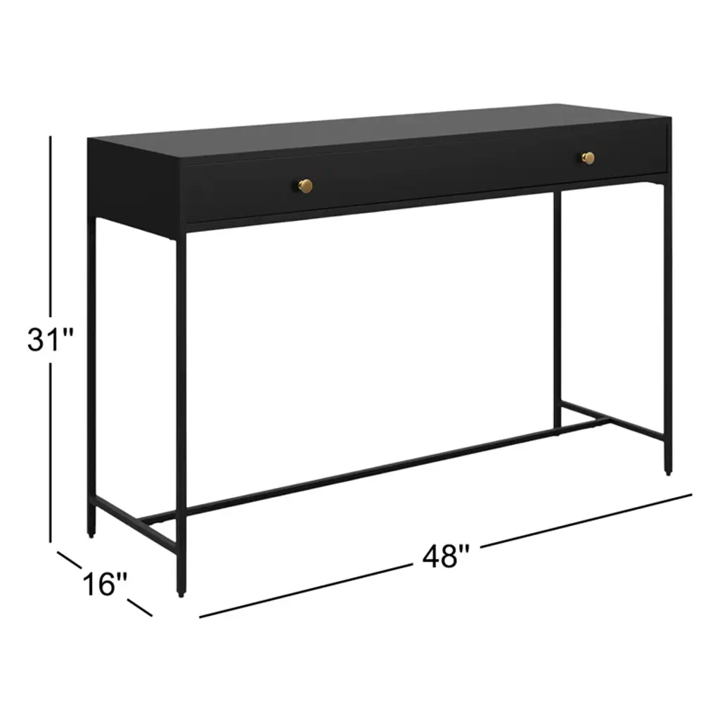 This console table combines style and functionality in a minimalist design. Crafted from iron with a sleek solid finish, it stands on slender legs with a stretcher bar for added stability. A spacious drawer with a gold-finished knob provides convenient storage for essentials. Its clean-lined silhouette makes it a perfect fit for a living room or entryway.