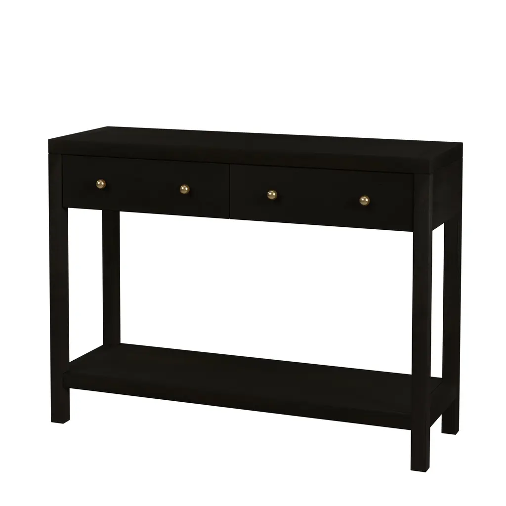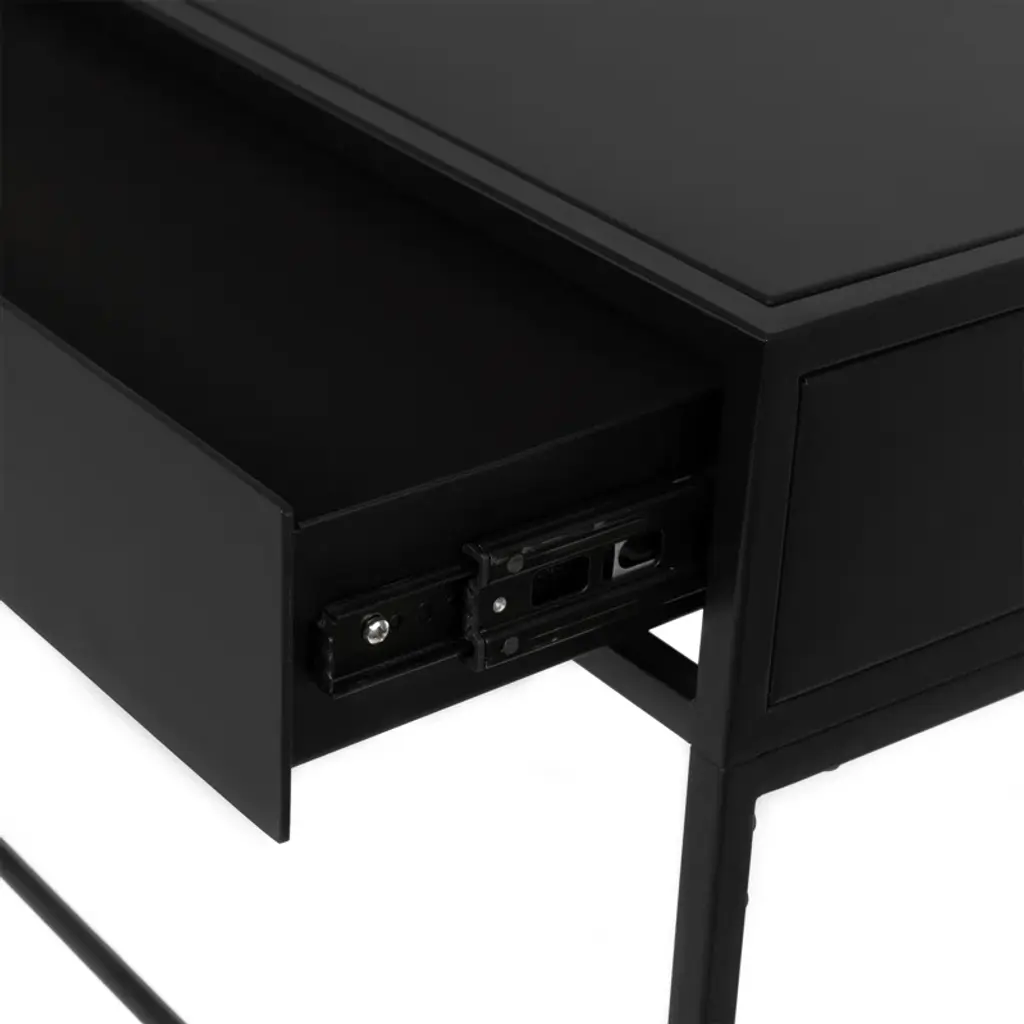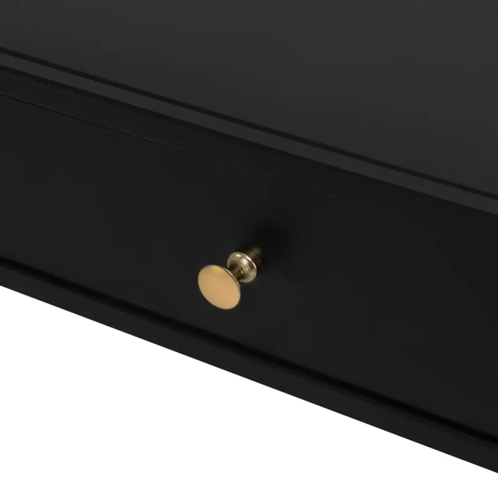 This console table combines style and functionality in a minimalist design. Crafted from iron with a sleek solid finish, it stands on slender legs with a stretcher bar for added stability. A spacious drawer with a gold-finished knob provides convenient storage for essentials. Its clean-lined silhouette makes it a perfect fit for a living room or entryway.
