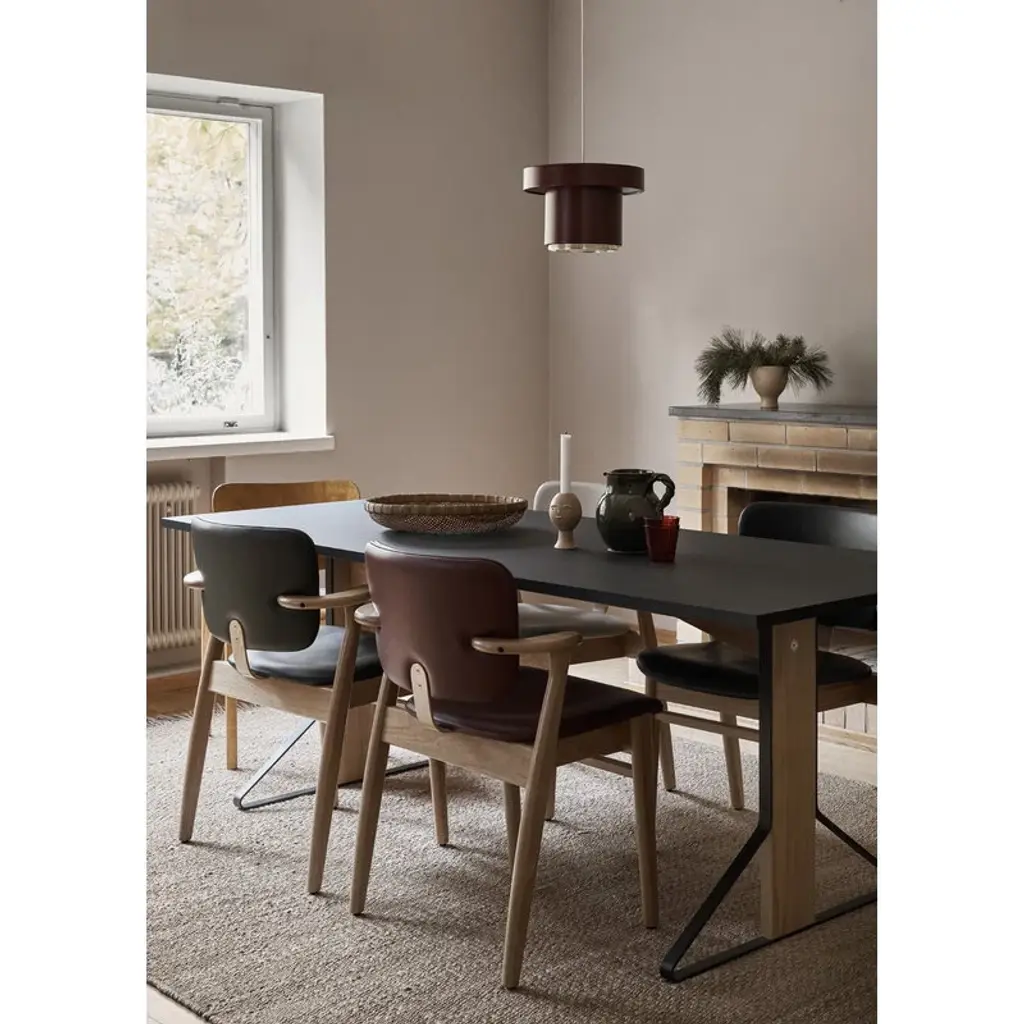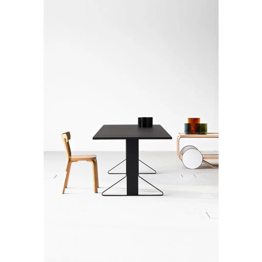 Artek’s Kaari table REB 001 features a table top made of black linoleum. Its length is 78.74 x 0 in (200 x cm, cm), width 33.46 in (85 cm) and thickness 0.94 x 0 in (2,4 x cm. cm). The materials of the base are black stained oak with protective varnish and black powder coated steel. The elegant Kaari collection was designed by Ronan and Erwan Bouroullec and launched at Stockholm’s Furniture Fair in 2015. As Alvar Aalto’s furniture was characterized by the L-leg, the Bouroullecs’ Kaari tables feature a unique leg system composed of vertical wood and bent steel. It became obvious during the design process that the legs could also be used to support wall-mounted objects such as shelves and consoles. The series has an attractive silhouette that is created by the wing-shaped steel structure. Kaari combines the traditional materials of Artek in a new and fresh way. Invest in a future classic and preserve it for generations to come.