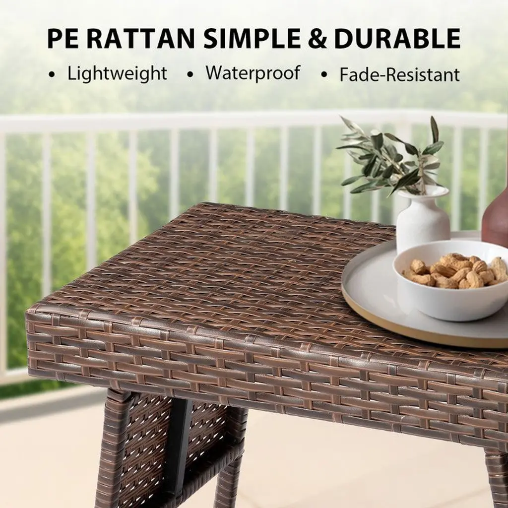 Elevate your outdoor living with this versatile Outdoor Folding Side Table. Designed for convenience and style, this patio coffee table features a weather-resistant PE rattan exterior and a sturdy steel frame, offering the perfect blend of durability and elegance. Its foldable design makes storage and portability effortless, while the compact tabletop keeps your essentials close at hand. Whether you're relaxing on the patio, by the pool, or in your garden, this wicker side table provides a stylish and functional companion.