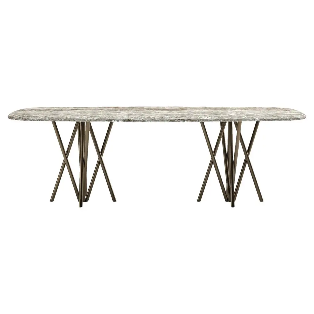 The TopTop table line is distinguished by its leg which can be either a round or square transparent section with a multi-faceted surface and metal core.
