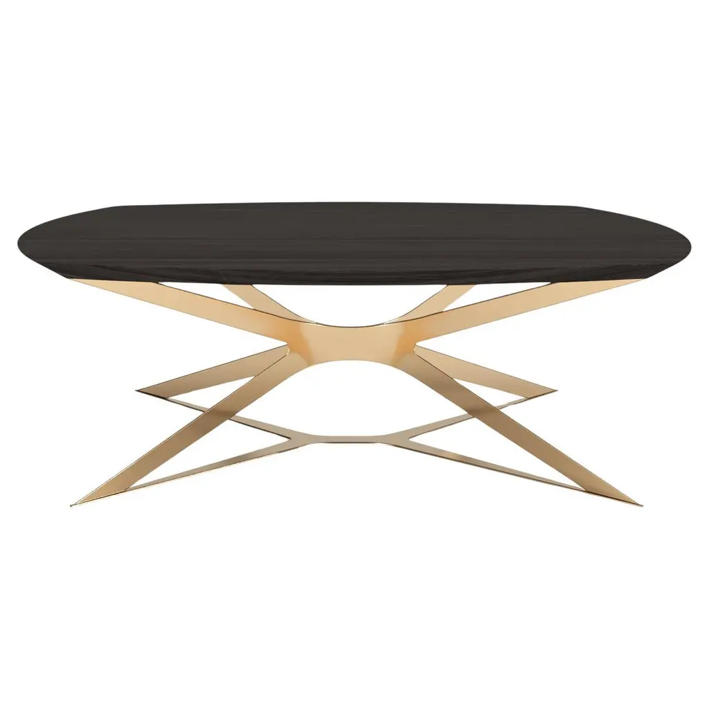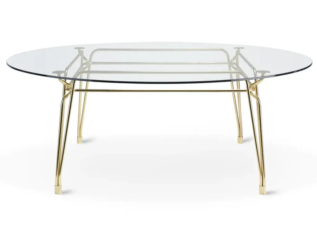 The TopTop table line is distinguished by its leg which can be either a round or square transparent section with a multi-faceted surface and metal core.