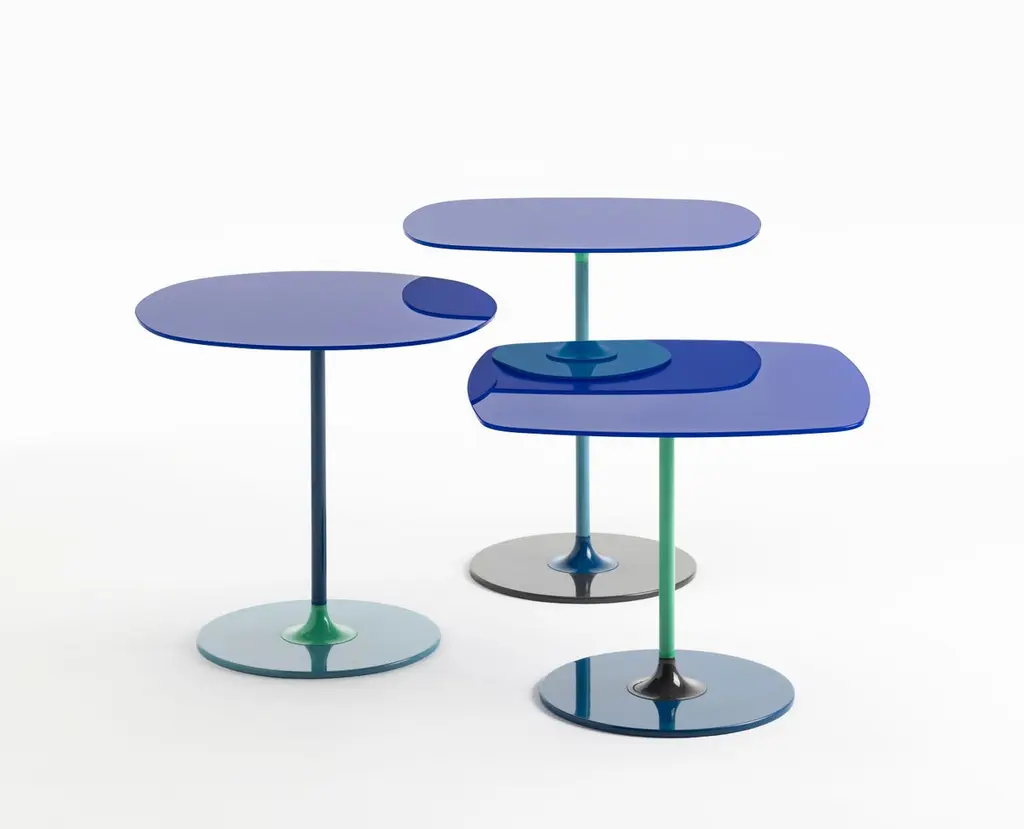 Thierry is a family of highly characteristic occasional tables that make an inspired use of colour. Each table can have 3 or 4 different colours and can be assembled in various ways. The beauty of these little tables lies in their jewel-like design. It comes in 3 different heights and shapes.Measures: 50 x 50 H 40.