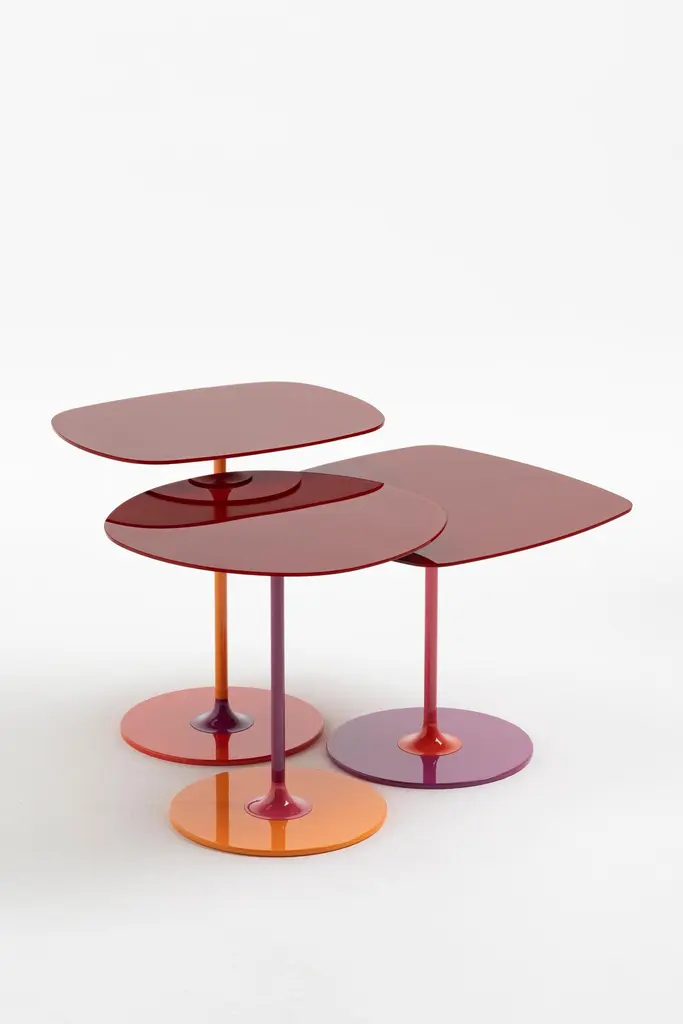 Thierry is a family of highly characteristic occasional tables that make an inspired use of colour. Each table can have 3 or 4 different colours and can be assembled in various ways. The beauty of these little tables lies in their jewel-like design. It comes in 3 different heights and shapes.Measures: 50 x 50 h 40.