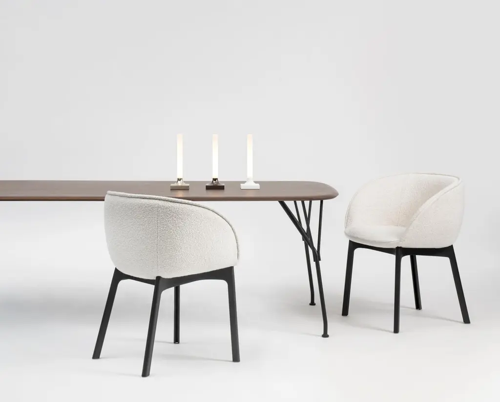 Viscount of wood tables are the latest addition. These naturally composed tables complement the collection's choice of seats and create a sustainable living area in which wood plays a central role thanks to its lightweight properties. These large items of furniture feature top-quality materials and advanced manufacturing technology. The square and rectangular versions with four legs come in five sizes (100x100, 145x80, 160x90, 190x90 and 240x100) and three top finishes: light ash with two darker shades, flamed walnut and a third, characterised by thin strips of different tones of dark wood. The legs are in chrome or black.