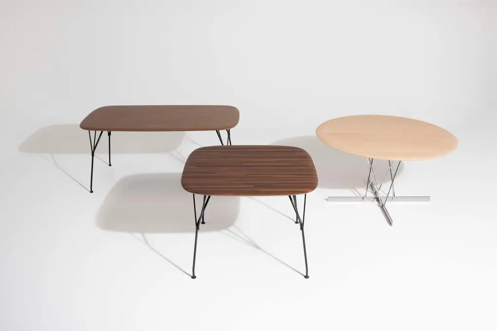 Viscount of wood tables are the latest addition. These naturally composed tables complement the collection's choice of seats and create a sustainable living area in which wood plays a central role thanks to its lightweight properties. These large items of furniture feature top-quality materials and advanced manufacturing technology. The square and rectangular versions with four legs come in five sizes (100x100, 145x80, 160x90, 190x90 and 240x100) and three top finishes: light ash with two darker shades, flamed walnut and a third, characterised by thin strips of different tones of dark wood. The legs are in chrome or black.