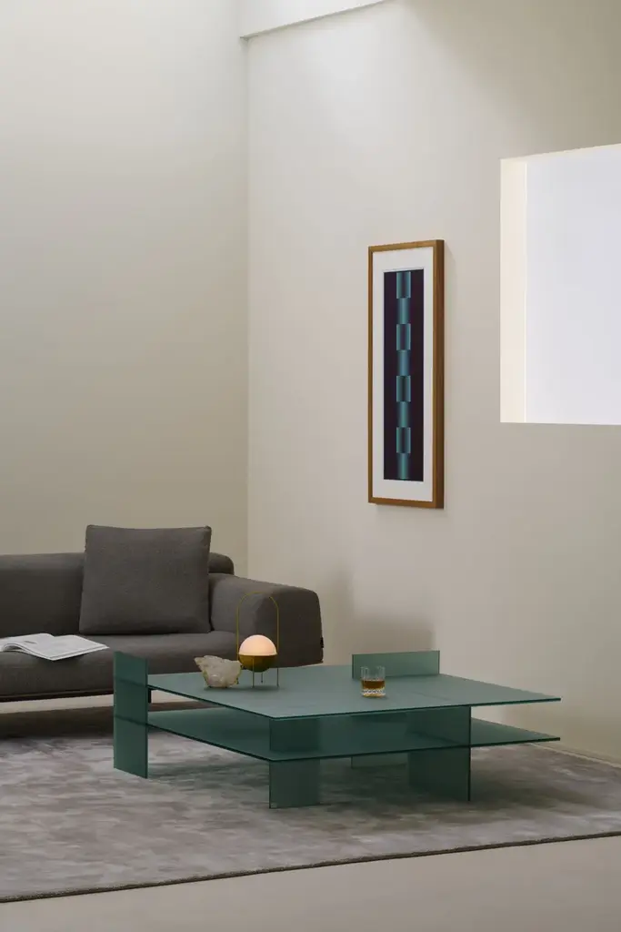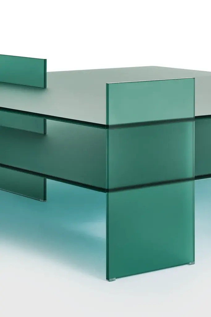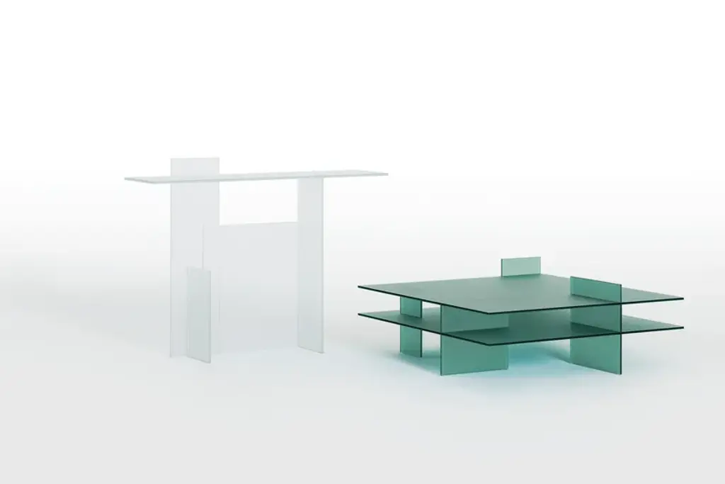 Kazimir is a low crystal table.Kazimir is a collection of furniture comprising shelves, consoles, bookcase and low tables, completely made of a special 10 mm tempered green or extra-clear double-sided acid-etched glass.Each item is a composition of interlocked and overlapping glass sheets which, through a special UV bonding method, realizes pure and refined sculptural furnishing elements characterized by a rigorous form.The shelves can be wall-mounted in either orientation.