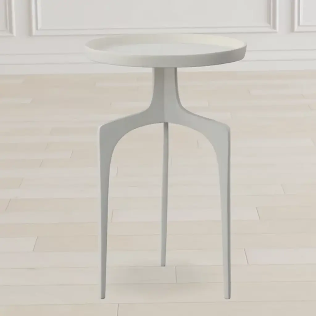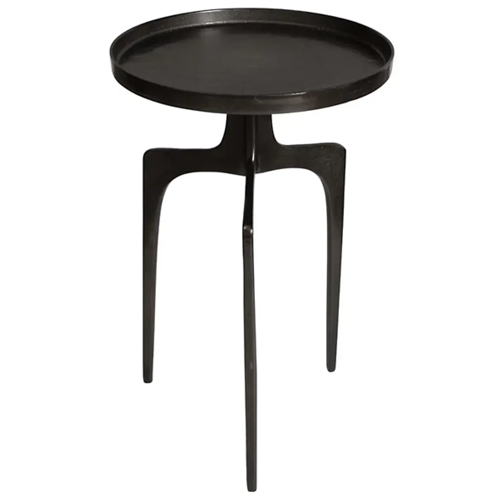 Reminiscent of antique furnishings, the Kenna Table from Uttermost garners one’s attention while quietly alone or supporting one’s objects. The modern design plays with shape and line like a refined sculpture. An aluminum construction helps the piece achieve a slender profile outlined in tight curves. The triangulating base looks airy and takes up minimal floor space. A circular top rests gracefully on top with a raised lip to keep spills and essential objects contained.