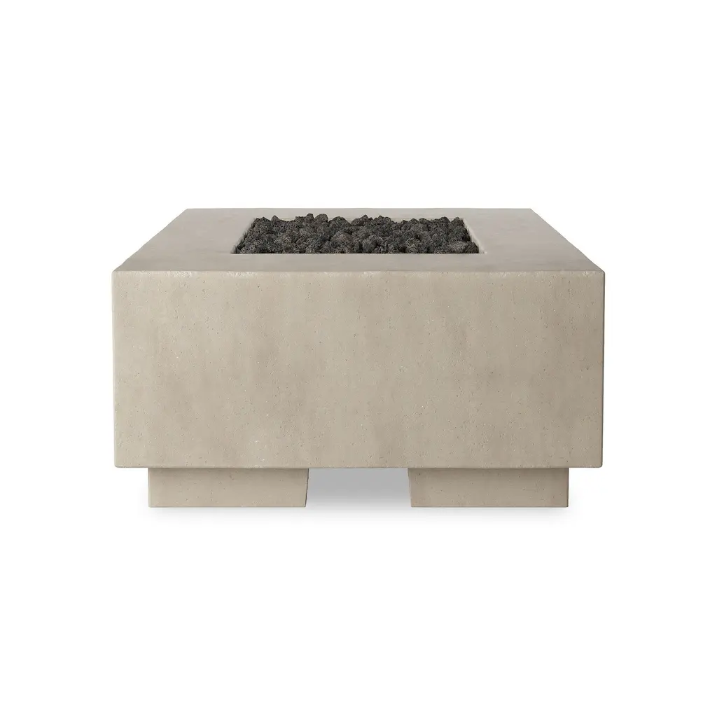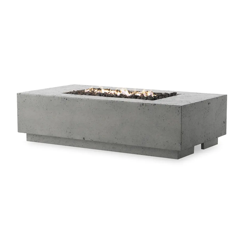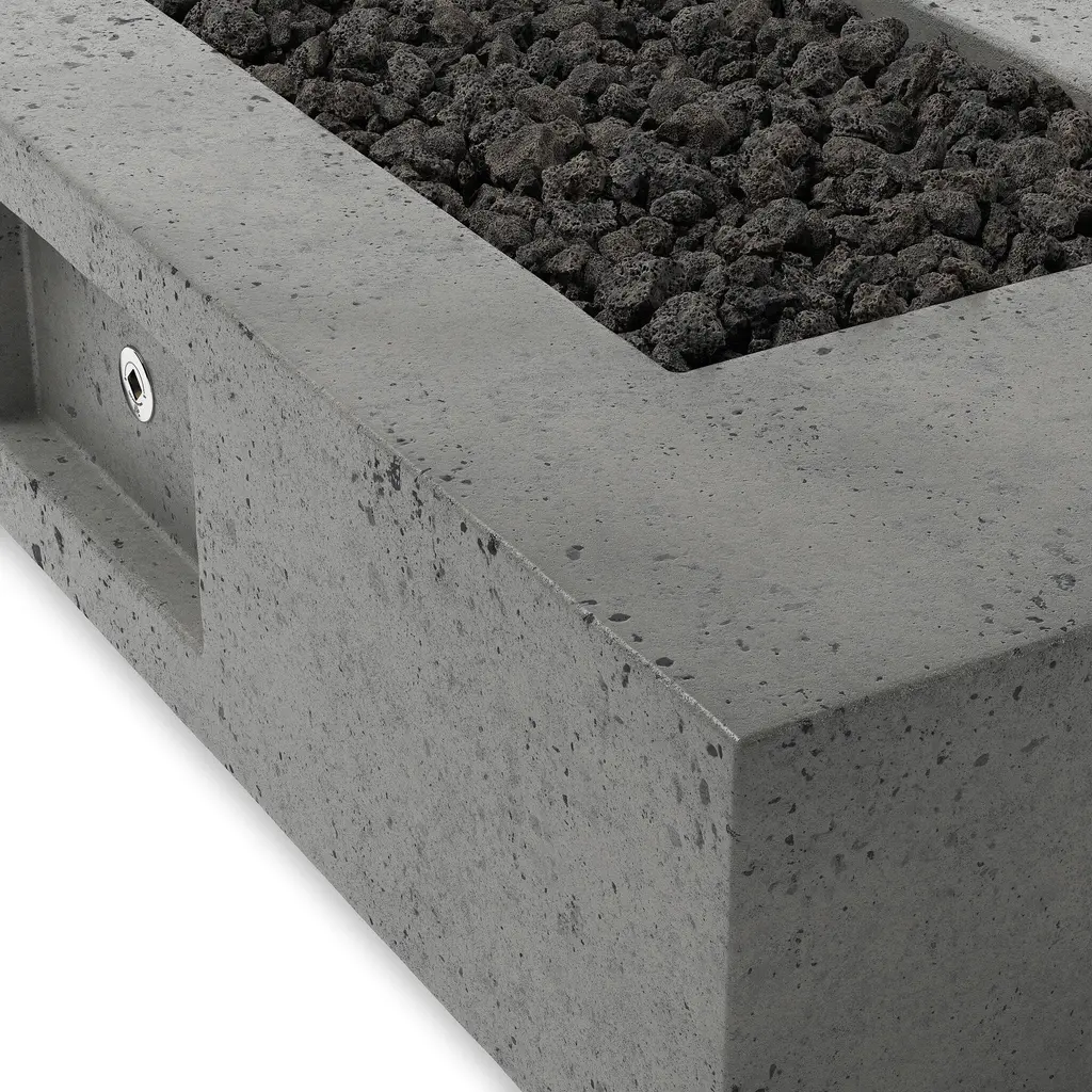 The Kenton Outdoor Fire Table displays refined material expression through its architectural presence and chromatic restraint. Crafted from glass-reinforced concrete, its monolithic silhouette creates a commanding focal point with distinguished simplicity. The surface's natural finishing process yields sophisticated tonal variations in pewter and dark grey—a testament to material authenticity and technical precision. Central lavastones complete the composition with textural contrast while maintaining chromatic harmony. Highlights