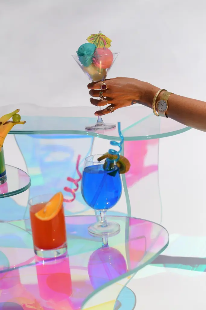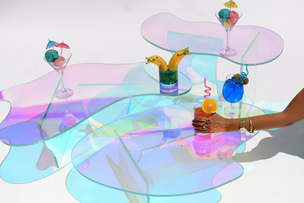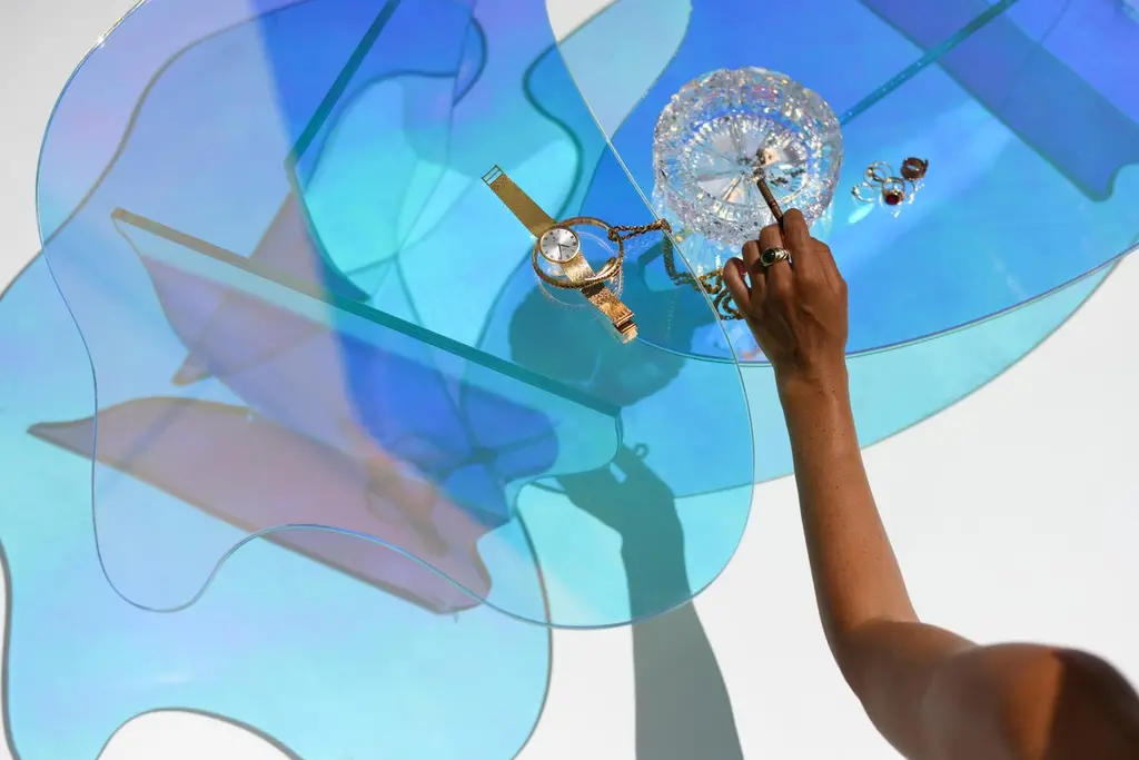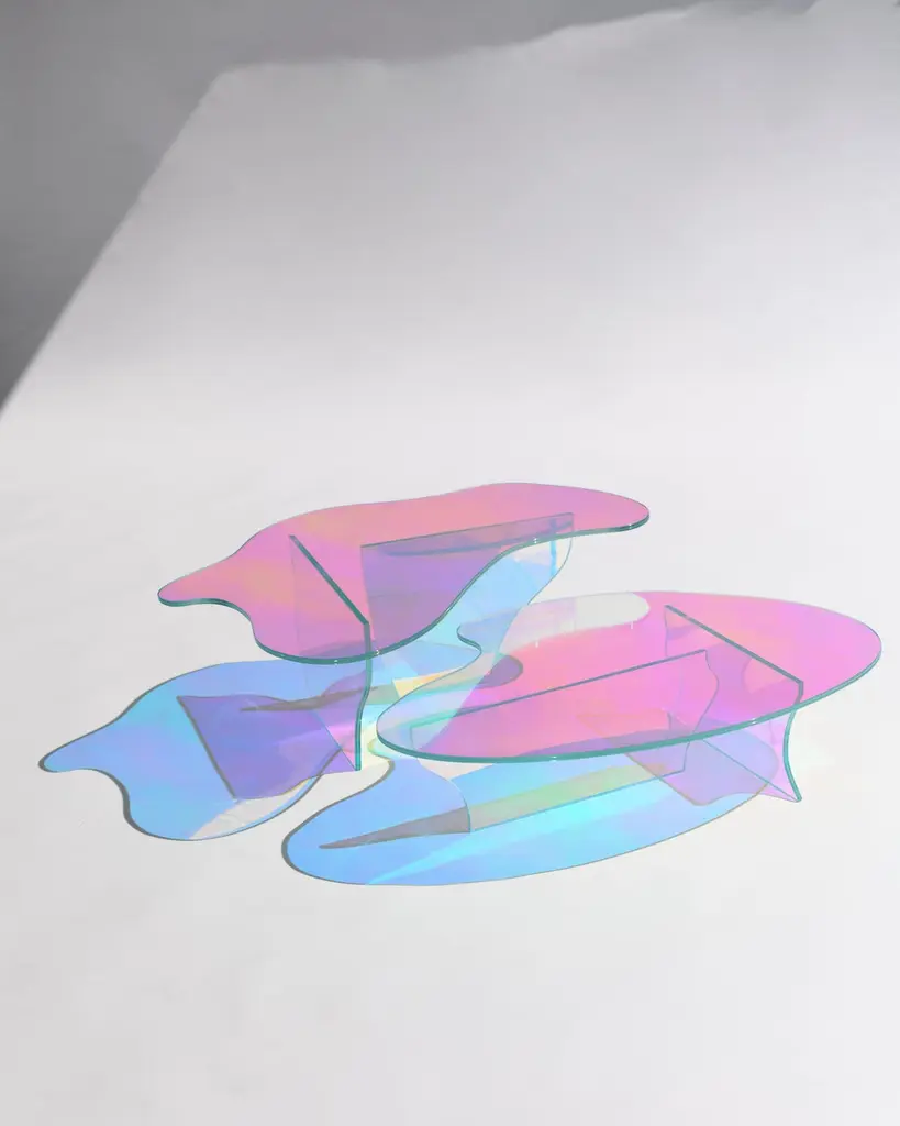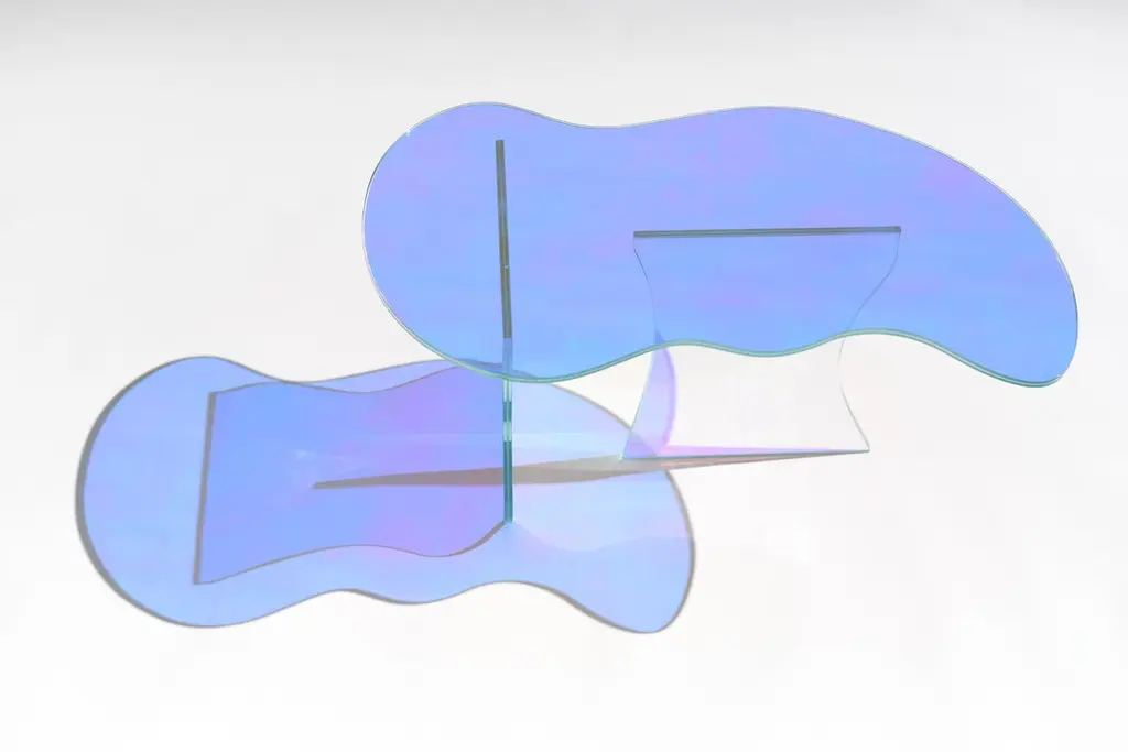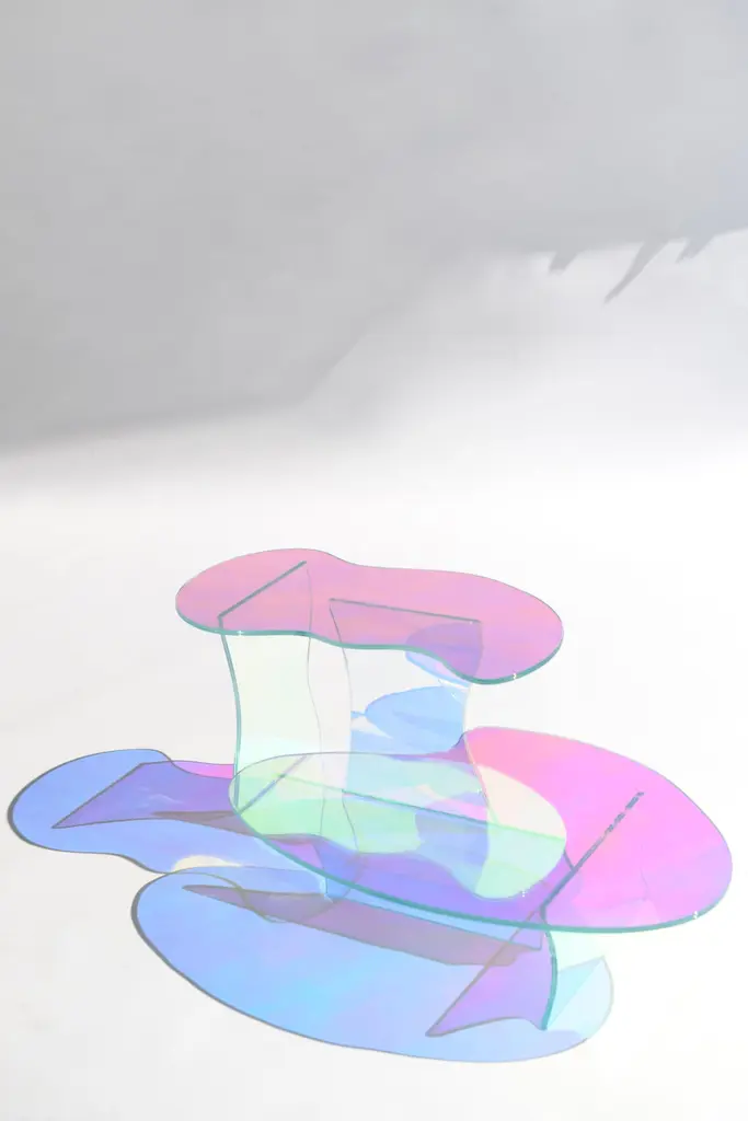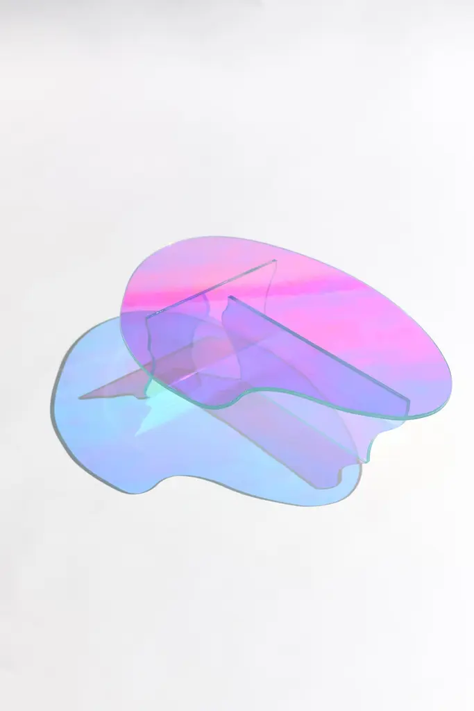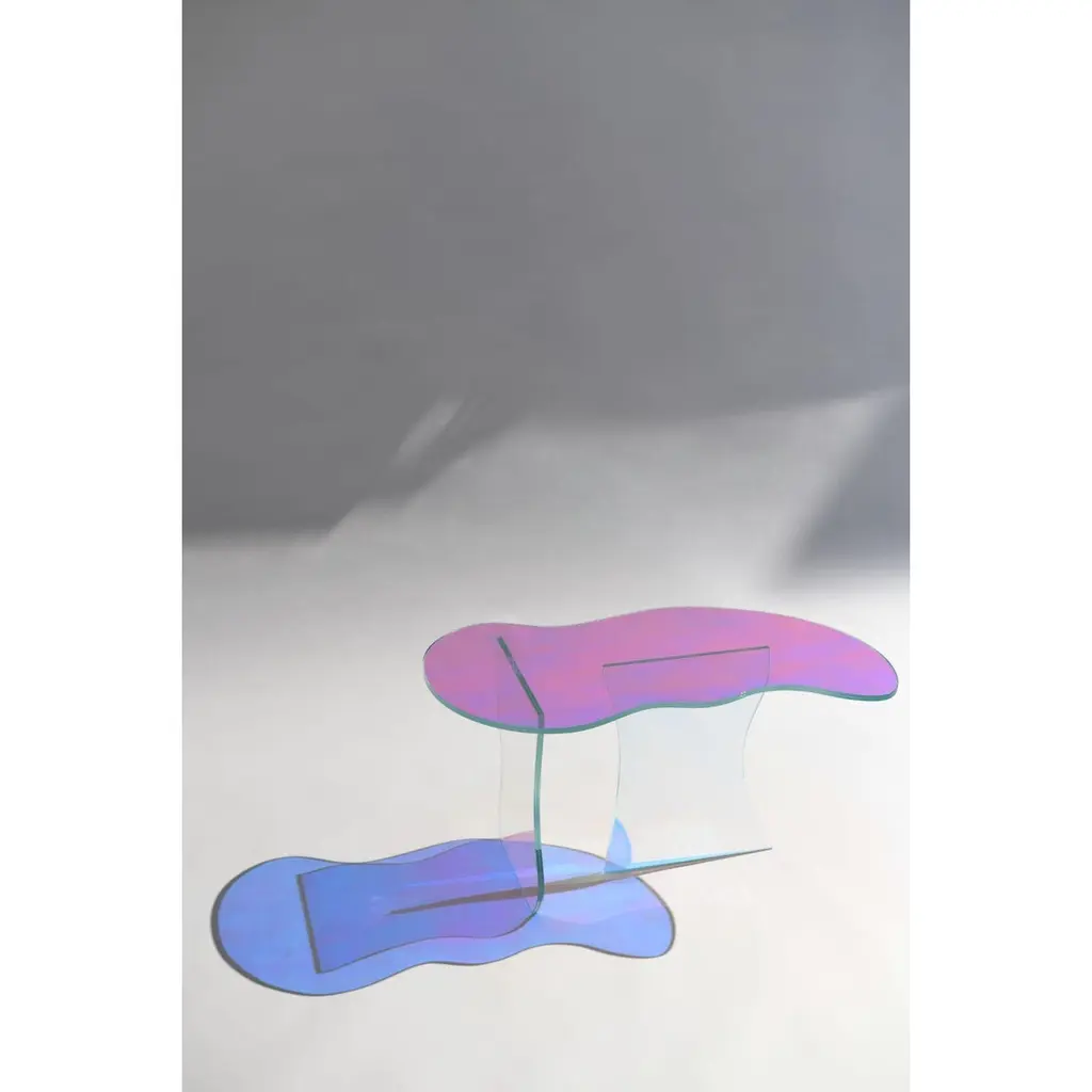 Kinetic colors glass table by Brajak VitbergMaterials: Glass, Dichroic filmDimensions: 77 x 43 x 40 cmBijelic and Brajak are two architects from Ljubljana, Slovenia.They are striving to design craft elements and make them timeless through experimental designing process.The studio creates a range of products from handmade and limited small series to one piece unique products, inspired by materials and forms that create incomplete perfection.