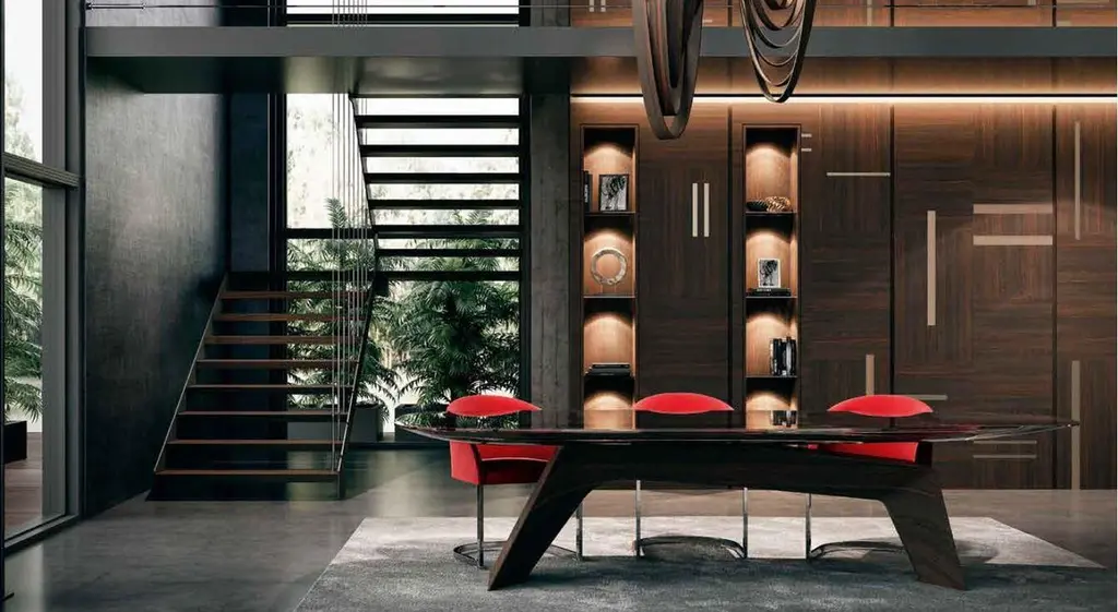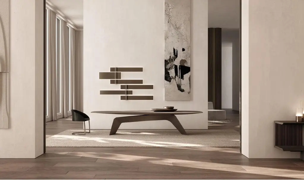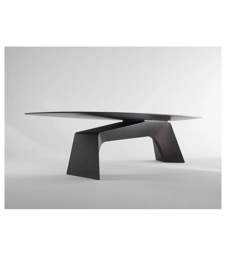 The Kintai table by Ferruccio Laviani for Emmemobili is a stunning example of modern design that combines sculpture and functionality. It merges organic shapes with the simplicity of Oriental aesthetics and exceptional craftsmanship. The tabletop is made of veneered plywood with a lacquered underplate, giving the design a sense of lightness. Notably, the table leg is crafted from a single block of molded veneered plywood, a bold design choice that makes the table both sturdy and elegant.The Kintai table is available in various sizes and finishes, making it a versatile piece for different interiors. The balance between the solid, imposing base and the seemingly floating tabletop creates a unique visual effect. This composition evokes the principles of Zen philosophy, where balance and calmness are key. The design and materials radiate both tranquility and movement—a reflection of the Zen idea that harmony is achieved through both stability and motion.Kintai is more than just a functional piece of furniture; it is a work of art that defines a space with its presence.