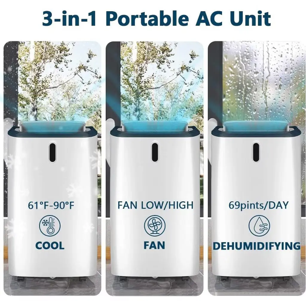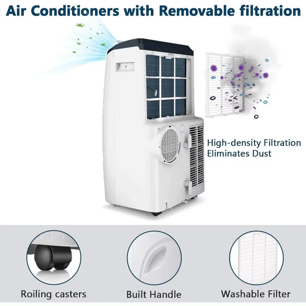 The Kismile portable air conditioner keeps your home cool and comfortable when and where you need it. Use year-round with a supplemental heat option. Remove excess moisture with dehumidifying dry mode and capture dust from the air with an easy-to-clean washable filter. Enjoy maximum comfort and quiet operation throughout the evening hours with sleep mode and 24 h timer. The louver is manually adjustable, change the air direction, offering you customizable comfort. The temperature can be adjusted between 61F and 90 F. And the operation is easy using through the control panel or remote control. The installation is effortless with included window installation kit and instructions. All with the ability to easily move from room to room using caster wheels. Please note that do regularly clean the air filter(commonly clean every 2 weeks).