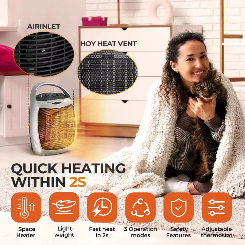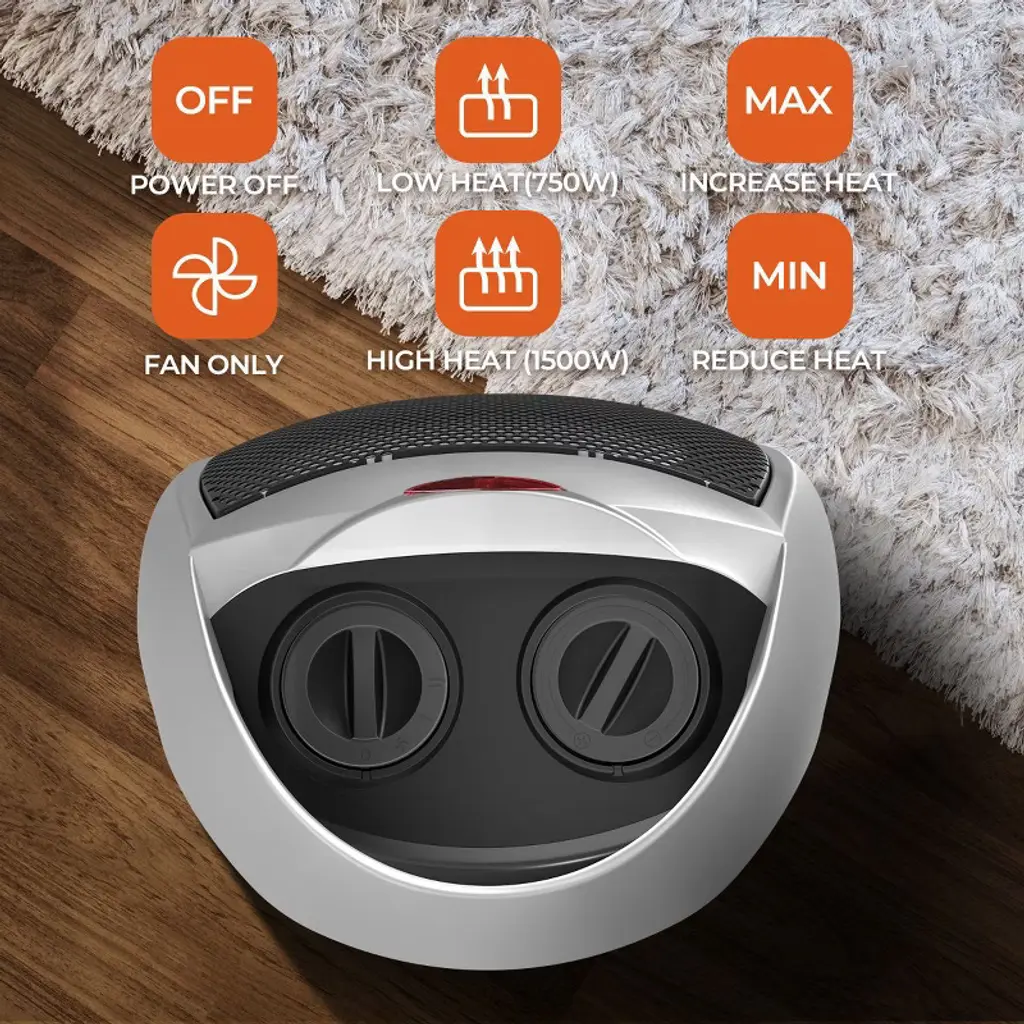 Engineered for versatile comfort, this compact heater delivers precision performance through three optimized modes: 950W Eco Mode (ideal for sustained gentle warmth), 1500W Turbo Heat (rapid temperature boost), and dedicated Fan Mode (ambient air circulation) — seamlessly adapting to workspace, bedroom, or travel scenarios. Featuring an integrated carry handle and briefcase-sized footprint, it stores effortlessly in car trunks, luggage, or backpacks while its weighted anti-slip base ensures stability on both floors and desks. Advanced vortex silencing technology maintains operation below 45 dB (quieter than light rain), guaranteeing undisturbed sleep environments. Safety is reinforced through triple-layer protection: 1) Adjustable thermostat prevents overheating and energy waste, 2) Dual auto-shutoff sensors trigger during critical temperature events, and 3) 45° tip-over cutoff with V0-grade flame-retardant materials. Whether enhancing home comfort, office productivity, or on-the-go warmth, this unit combines whisper-quiet reliability with uncompromising safety.