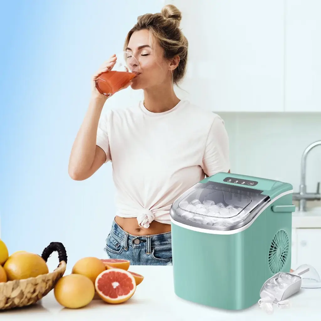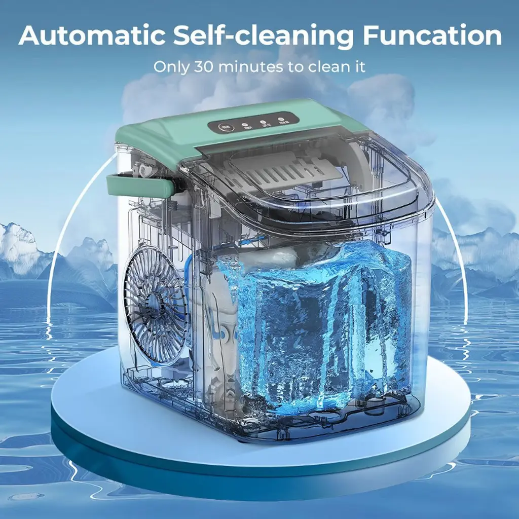 The portable countertop ice maker is the easiest and perfect way to bring ice into your home. Equipped with a high efficiency R600A compressor, this ice maker is capable of making ice quickly, with each round taking 8 minutes to make 9 pieces of Half-Cube-shaped ice per cycle, making up to 26LB of ice in a day. It is equipped with an auto-cleaning function, simply fill the water tank with water and then long press the ice making/cleaning button for 5 seconds to start the auto-cleaning. It will be the perfect addition to your kitchen. The large window allows you to keep the ice cool while checking on the production. Featuring with portable yet compact design, this premium ice maker machine is perfect for home, office, parties, and bars.