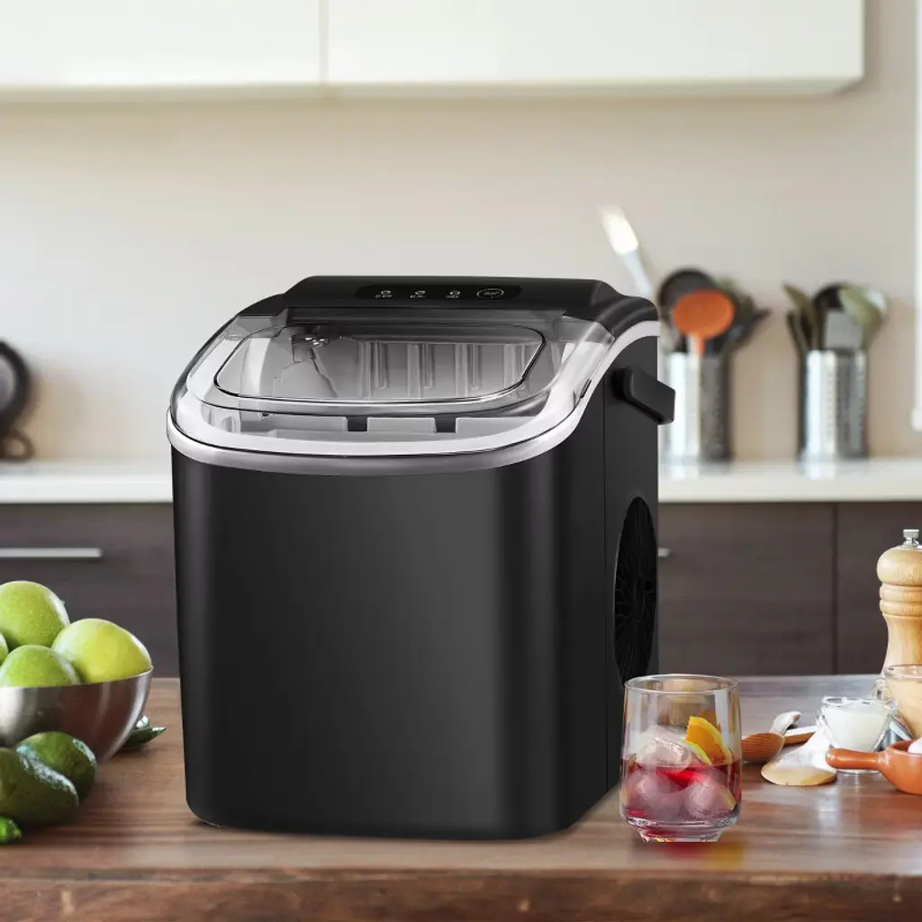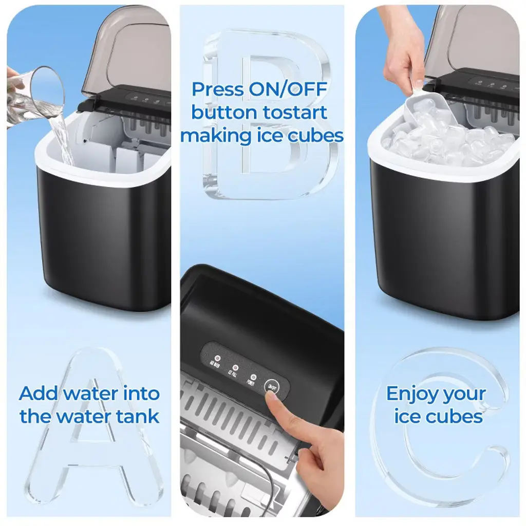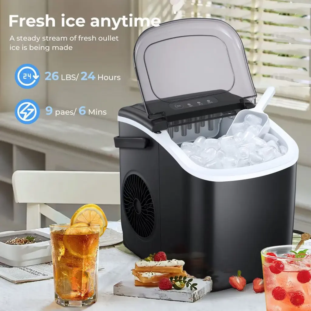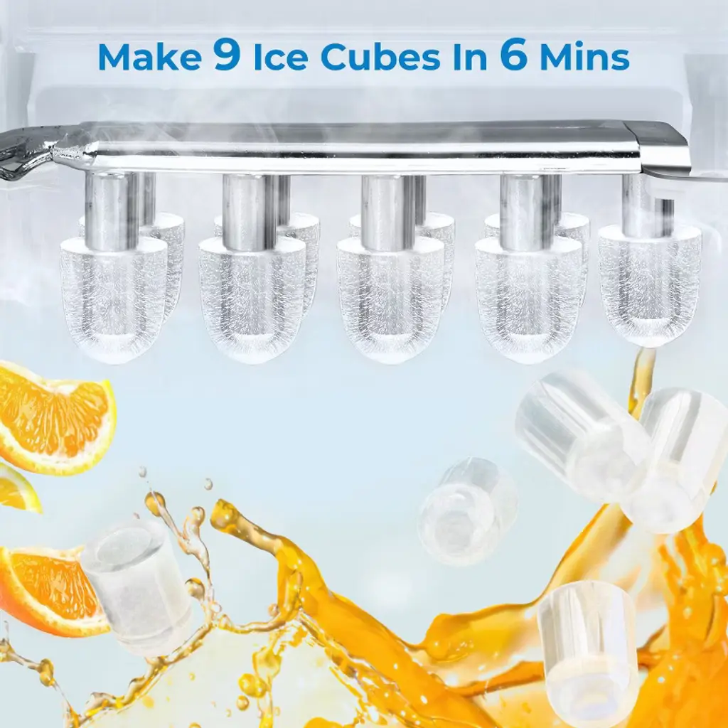 The portable countertop ice maker is the easiest and perfect way to bring ice into your home. Equipped with a high efficiency R600A compressor, this ice maker is capable of making ice quickly, with each round taking 8 minutes to make 9 pieces of Half-Cube-shaped ice per cycle, making up to 26LB of ice in a day. It is equipped with an auto-cleaning function, simply fill the water tank with water and then long press the ice making/cleaning button for 5 seconds to start the auto-cleaning. It will be the perfect addition to your kitchen. The large window allows you to keep the ice cool while checking on the production. Featuring with portable yet compact design, this premium ice maker machine is perfect for home, office, parties, and bars.